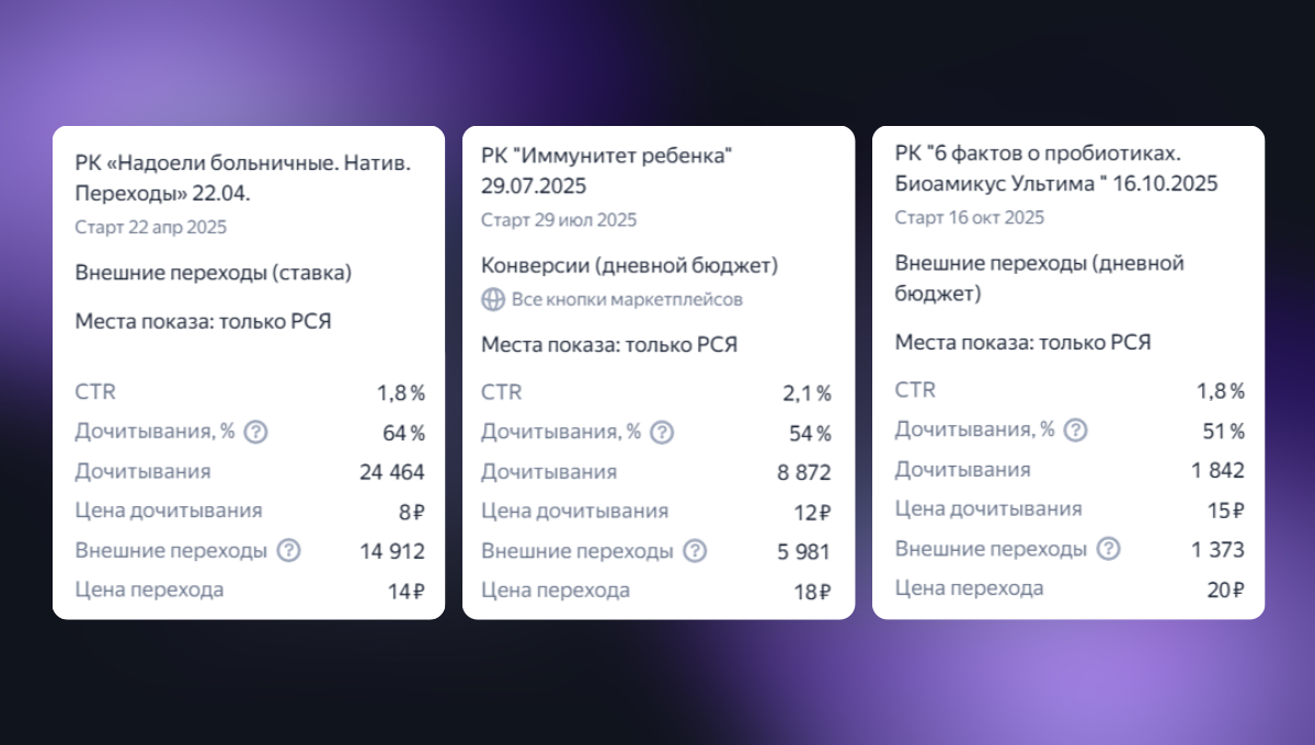 Трафик с ПромоСтраниц мы направляли на лендинги с подробным описанием препаратов. С посадок продюсер еженедельно делал срез качества трафика и конверсий — переходов на маркетплейсы. Цепочка касаний выглядела так: ПромоСтраницы — лендинг — маркетплейс — покупка.
