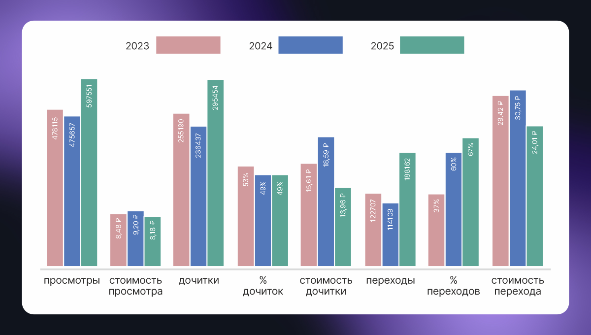 Анализ трафика. Много дешёвых дочиток не означает много качественного трафика. Мы углублялись в Метрику и оценивали: сколько пользователей приходит с текста на посадку, по какой цене, с какими поведенческими показателями. Смотрели трафик в разрезе кампаний и обложек — вдруг какой-то креатив тащит мусор. Если с трафиком проблемы — возвращались к текстам, обложкам и настройкам.