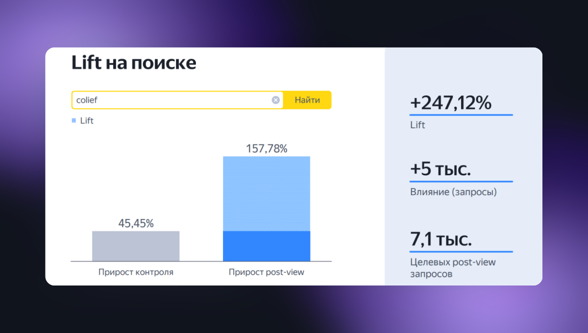 Часть пользователей сразу переходила на маркетплейсы, другая возвращалась через последующие касания. Отчёт «Lift на поиске» показал впечатляющую картину: интерес к бренду у людей, прошедших через ПромоСтраницы, был в 3 раза выше, чем у тех, кто не читал статьи. На примере бренда Colief естественный рост интереса составил 45%, а у аудитории ПромоСтраниц — значительно выше.