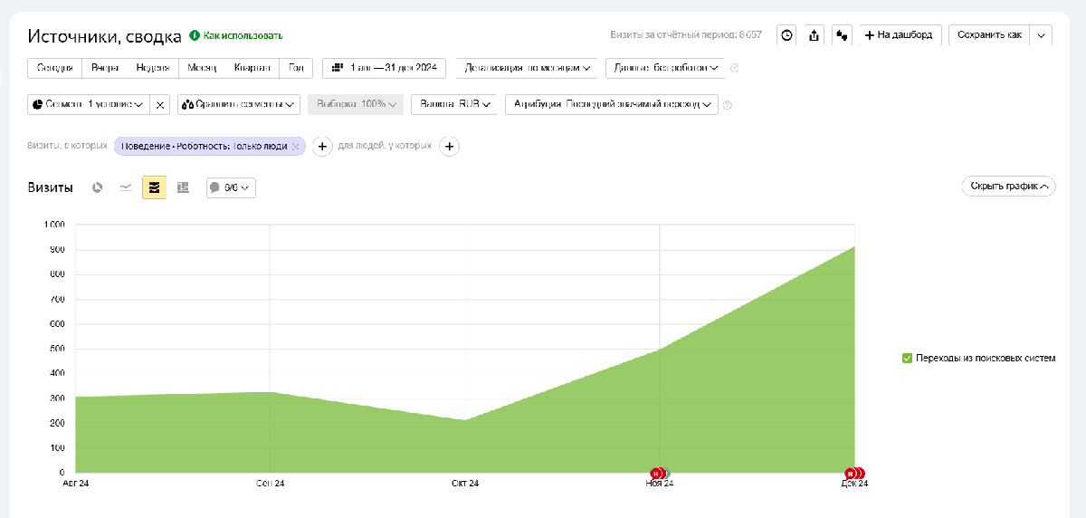 Также продолжили работы со структурой заголовков и по написанию текстов. Уже к концу второго месяца зафиксировали положительную динамику — значительный рост органического трафика, что подтвердило эффективность выбранной стратегии.