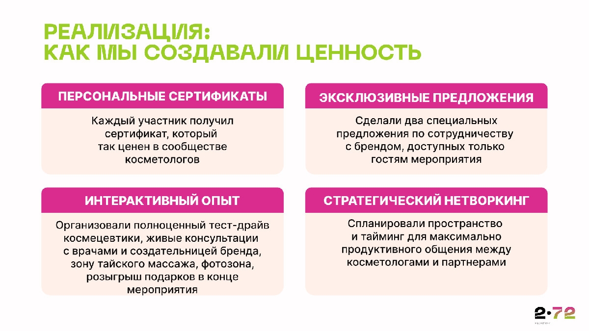 • Стратегический нетворкинг – спланировали пространство и тайминг для максимально продуктивного общения между косметологами и партнерами