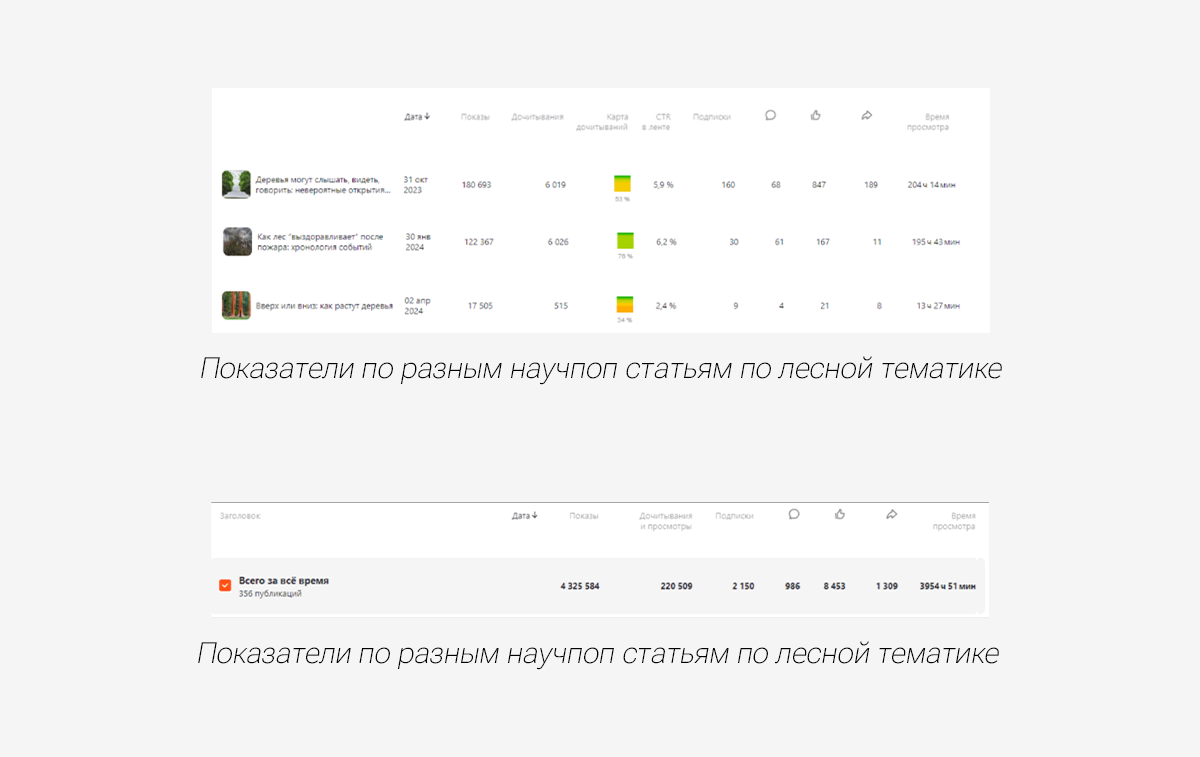 Так, одной из самых популярных и вовлекающих статей на канале стала “Деревья могут слышать, видеть, говорить: невероятные открытия нейробиологов” — 6 019 дочитываний, 160 подписок, 847 лайков. Вслед за ней было решено писать еще статьи научно-популярного характера на схожую тематику. В результате статья “Как лес “выздоравливает” после пожара: хронология событий” собрала 6 026 дочитываний, 30 подписок, 167 лайков. Относительно недавняя статья “Вверх или вниз: как растут деревья” уже принесла 515 дочитываний, 9 подписок, 21 лайк.
