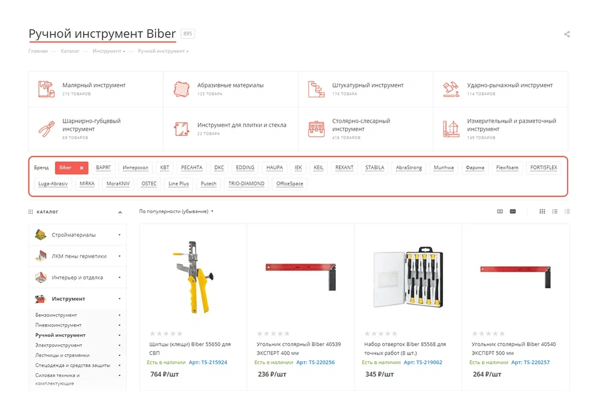 Создали 1500 посадочных страниц по свойству «Бренды». Это позволило посетителям сразу попадать на подборку нужных товаров, а не искать их через весь каталог. Для удобной навигации между брендами внедрили облако тегов с переключением в один клик.