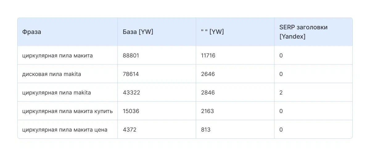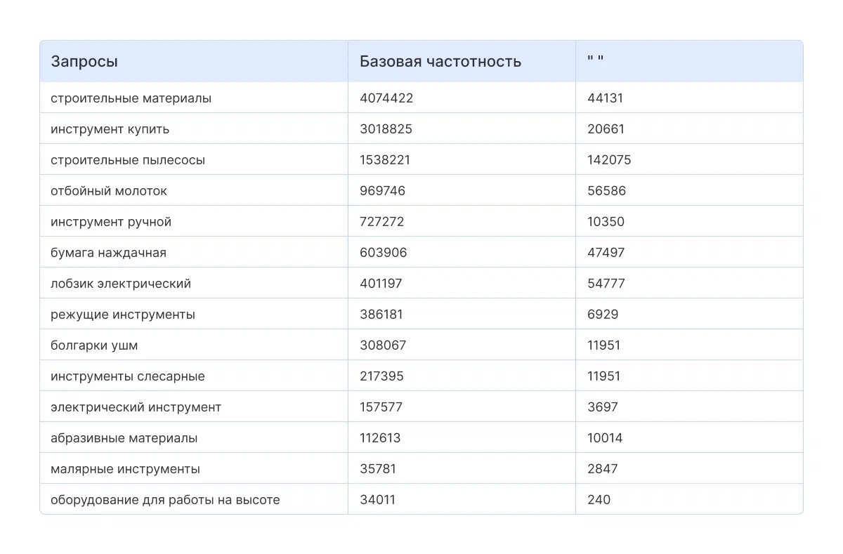 Второй этап включал сбор семантического ядра из 4924 поисковых запросов. Анализ показал высокий спрос на инструменты в связке с брендами. Все запросы сгруппировали в кластеры по интенту пользователей — целям поиска вроде «Цена» или «Купить». На основе семантики спроектировали новую структуру сайта и скорректировали названия разделов.