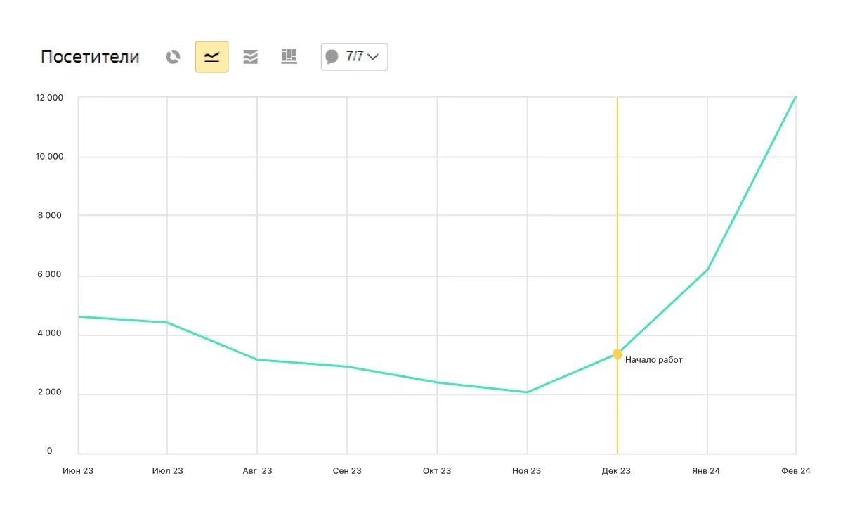 - Увеличение поискового трафика в 4 раза — с 3000 до 12000 посетителей за период с декабря 2023 по февраль 2024