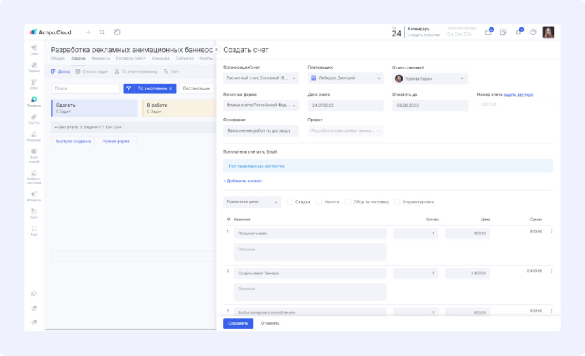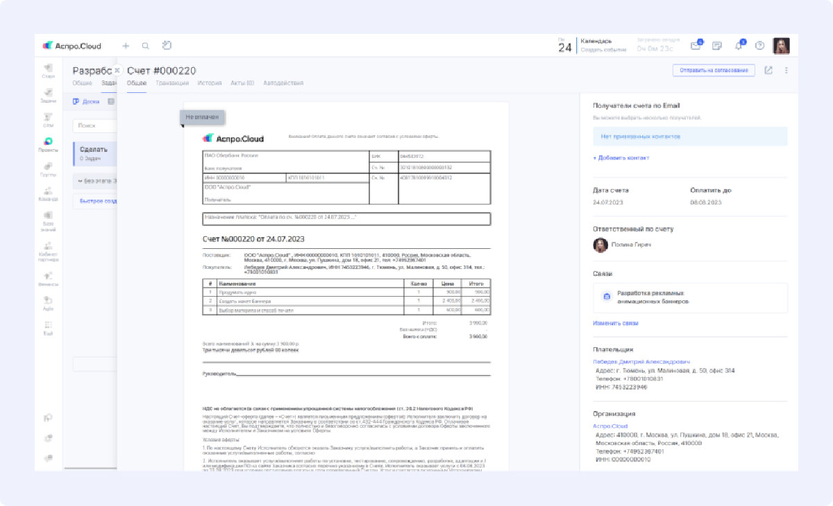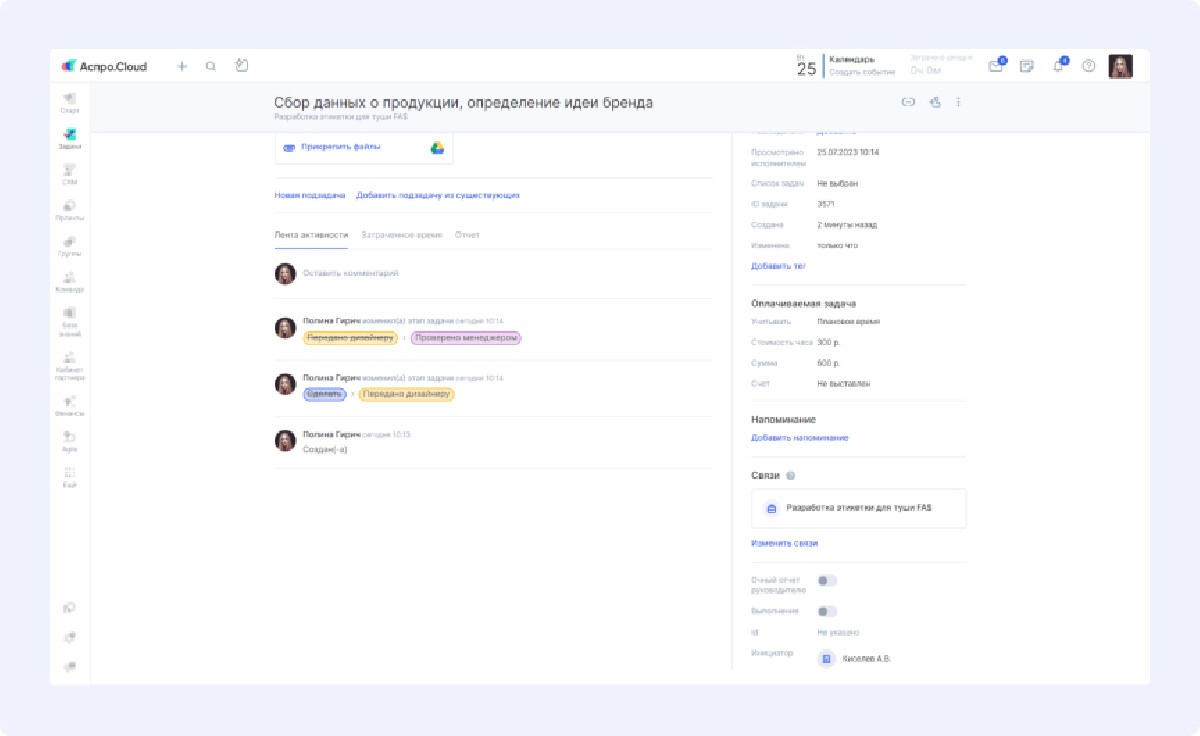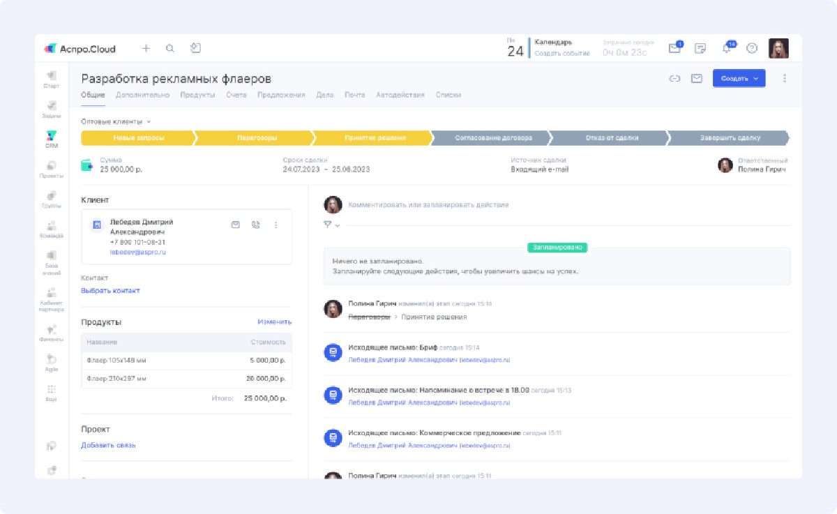 По словам руководителя, Аспро.Cloud работает скорее как система планирования и контроля, чем классическая CRM. Это позволяет гарантировать клиентам качественный результат в установленные сроки и поддерживать высокие стандарты сервиса.