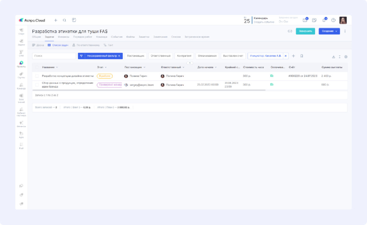 Разработчики Аспро.Cloud создали дополнительные поля и фильтры: поле «Сумма» в списке задач для отслеживания стоимости отдельных задач и проектов, фильтр для разделения оплачиваемых и неоплачиваемых задач, инструмент контроля выставленных счетов.