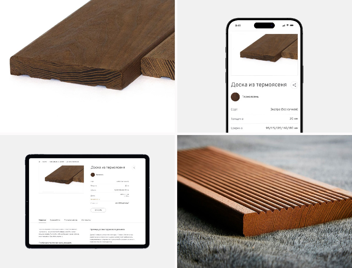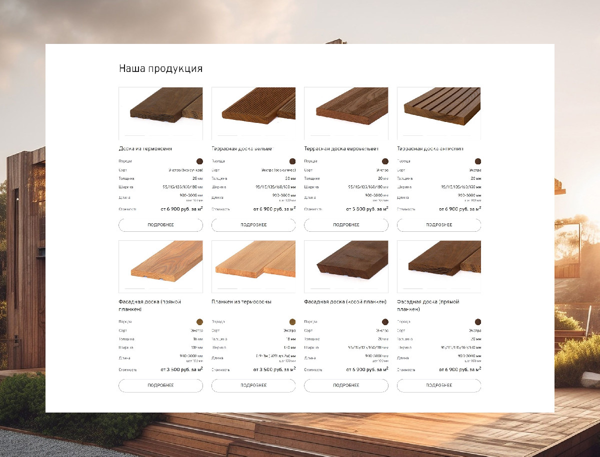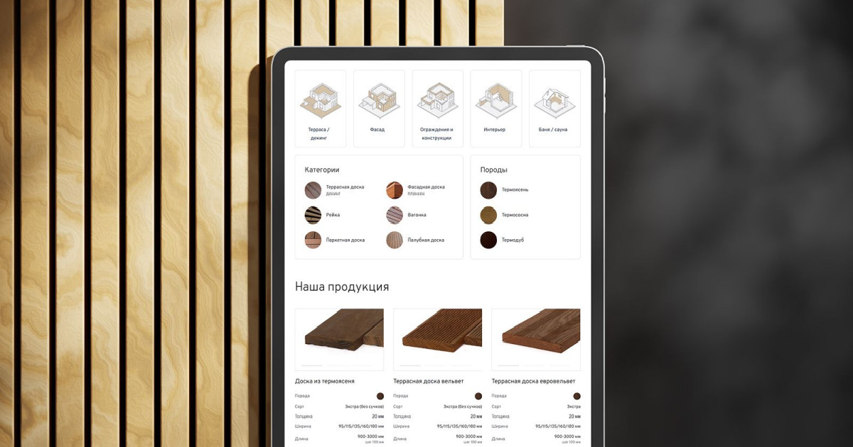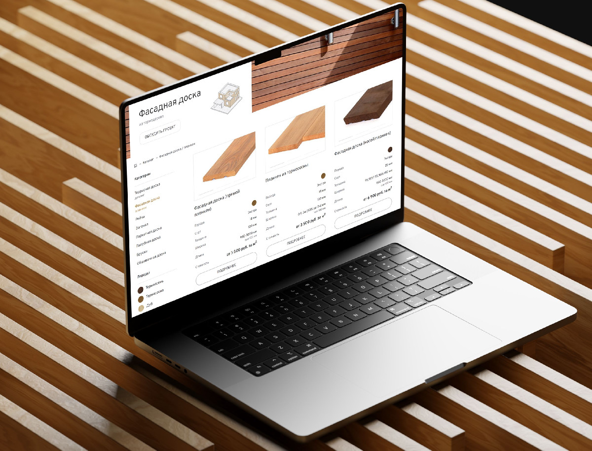 Разработать онлайн-каталог для компании «Термоясень», специализирующейся на производстве термодревесины, включая фасадную и террасную доску. Каталог должен был представить продукцию компании, её преимущества и обеспечить удобство взаимодействия для потенциальных клиентов.
