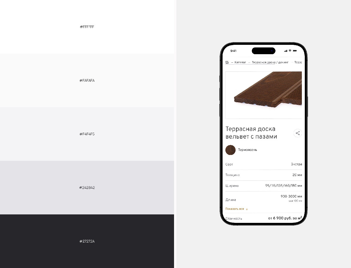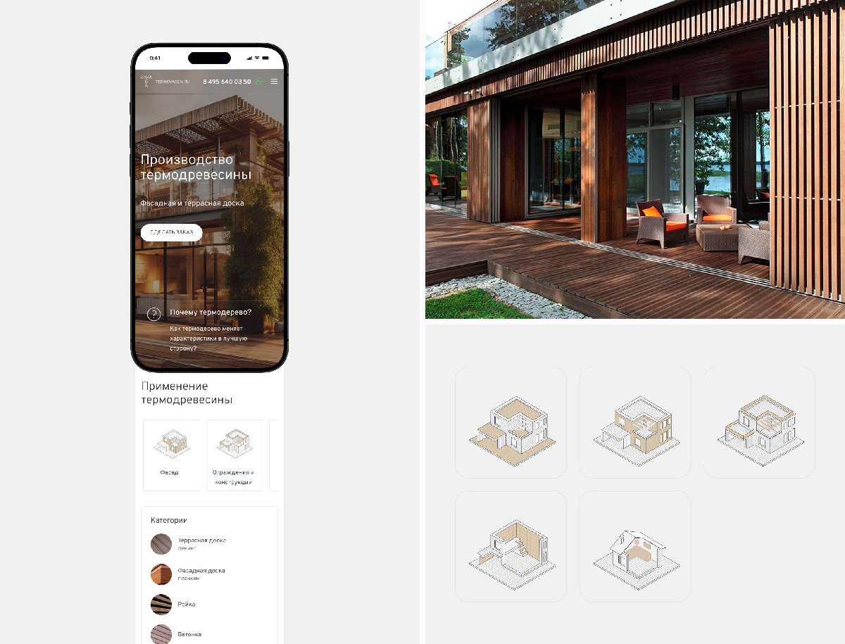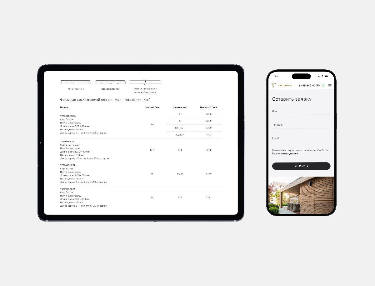 Разработать онлайн-каталог для компании «Термоясень», специализирующейся на производстве термодревесины, включая фасадную и террасную доску. Каталог должен был представить продукцию компании, её преимущества и обеспечить удобство взаимодействия для потенциальных клиентов.