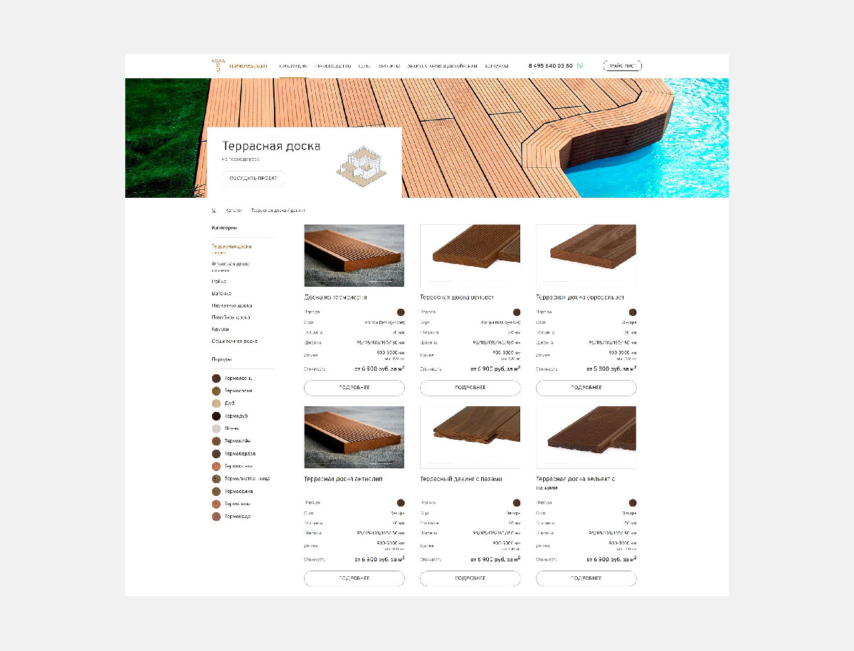 Разработан удобный каталог с фильтрами по типам продукции: фасадная доска, террасная доска, термодревесина.