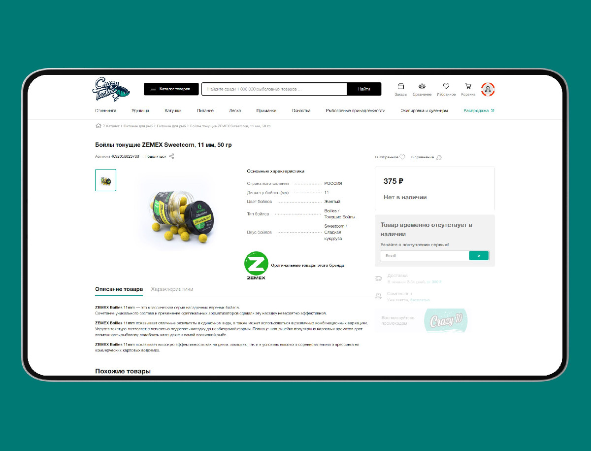 Разработать интернет-магазин для рыболовного магазина «Crazy Tackle», который бы представлял товары торговых марок ZEMEX и METSUI ORANGE LIFE, обеспечивал удобство выбора и покупки, а также поддерживал доставку по всей России и за рубеж. Сайт должен был стать официальной торговой площадкой для розничных онлайн-продаж.