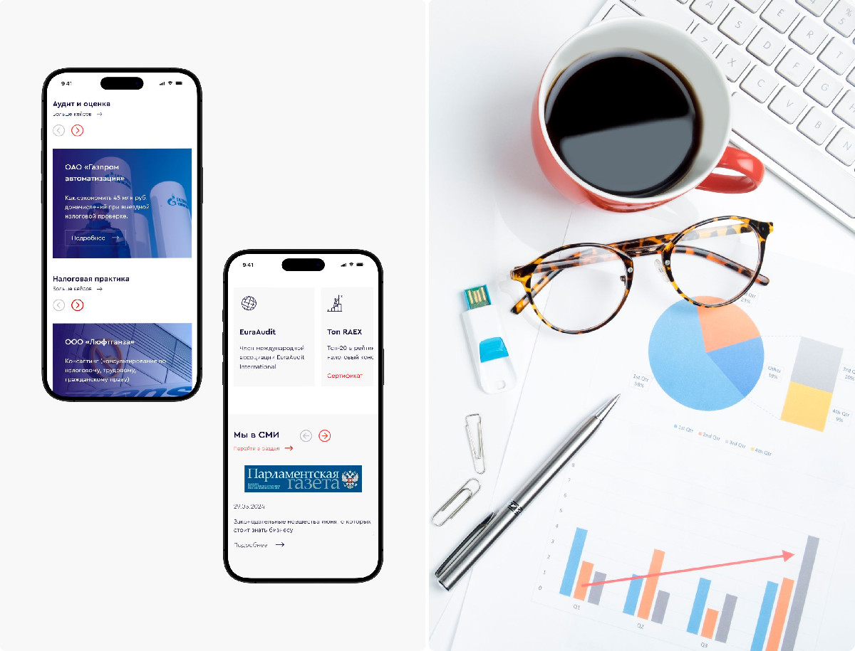 Разработка корпоративного сайта для аудиторско-консалтинговой группы «Аудит и право» успешно завершена. Созданный ресурс сочетает репрезентативность и функциональность, обеспечивая четкую структуризацию сложной юридической и аудиторской информации. Сдержанный дизайн с продуманными акцентами и интуитивная навигация подчеркивают профессионализм компании, делая контент доступным для целевой аудитории. Сайт стал эффективным инструментом укрепления деловой репутации и повышения уровня доверия со стороны клиентов и партнеров.