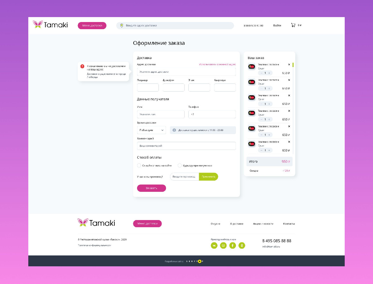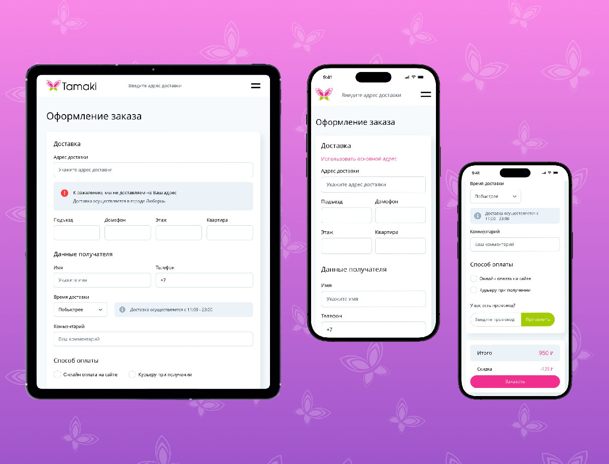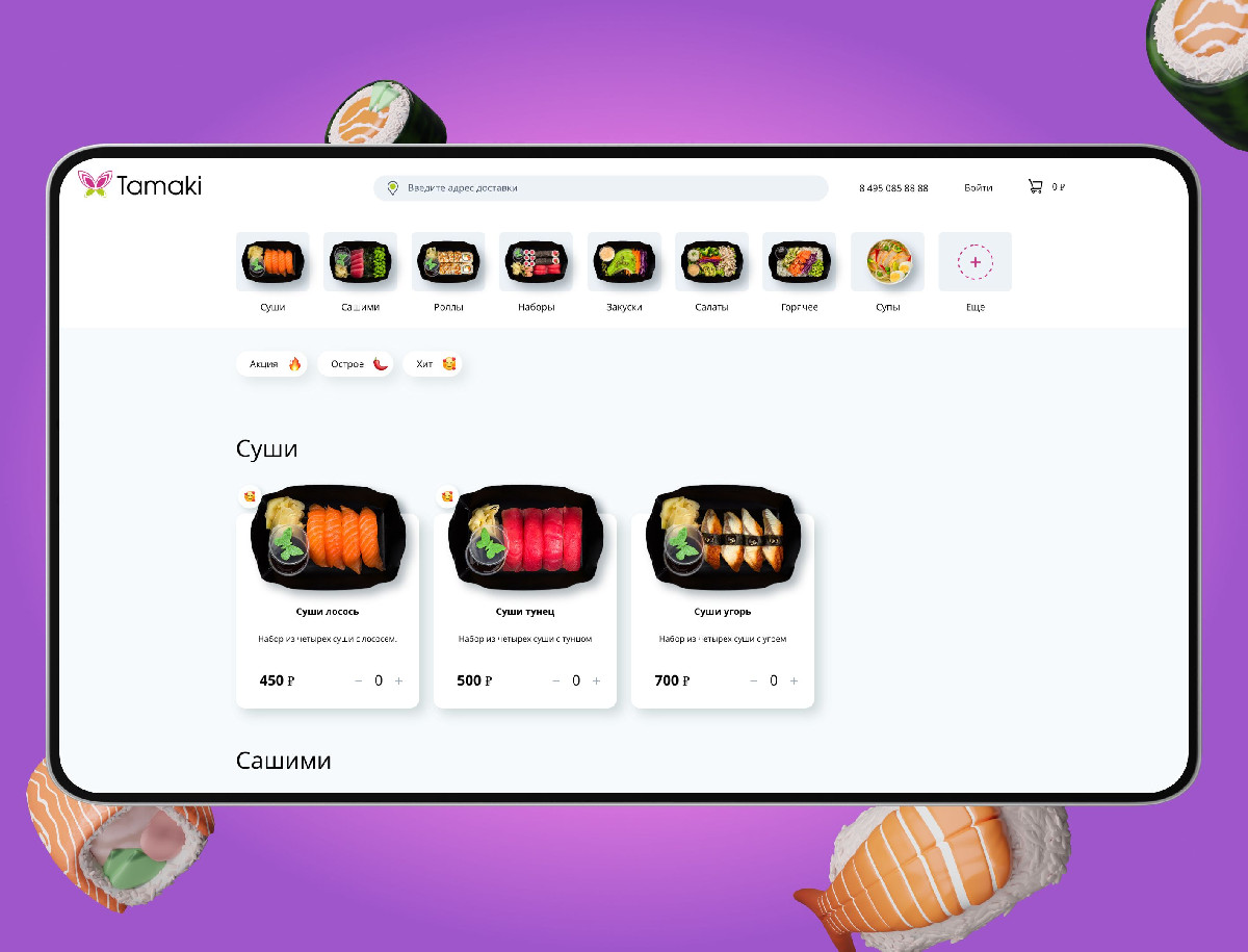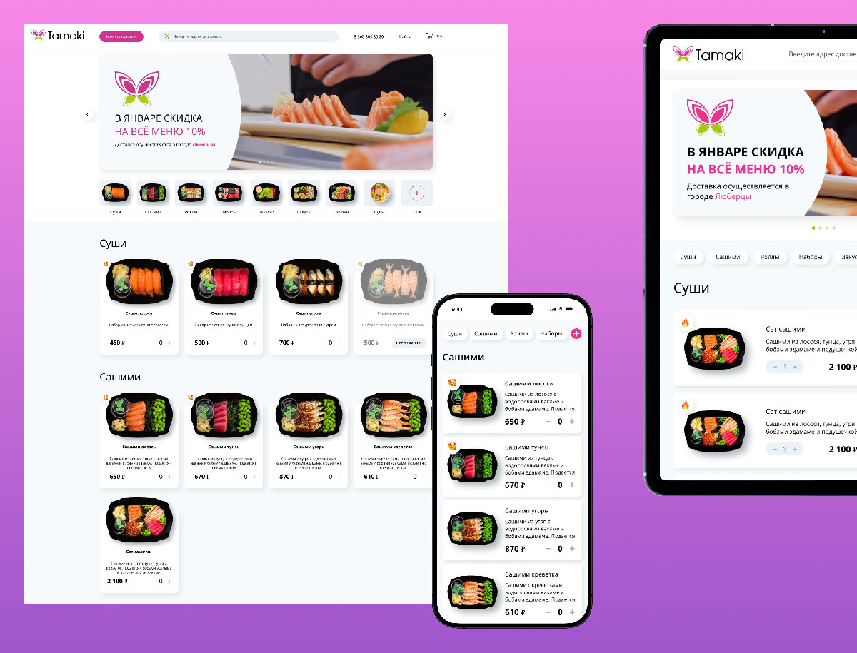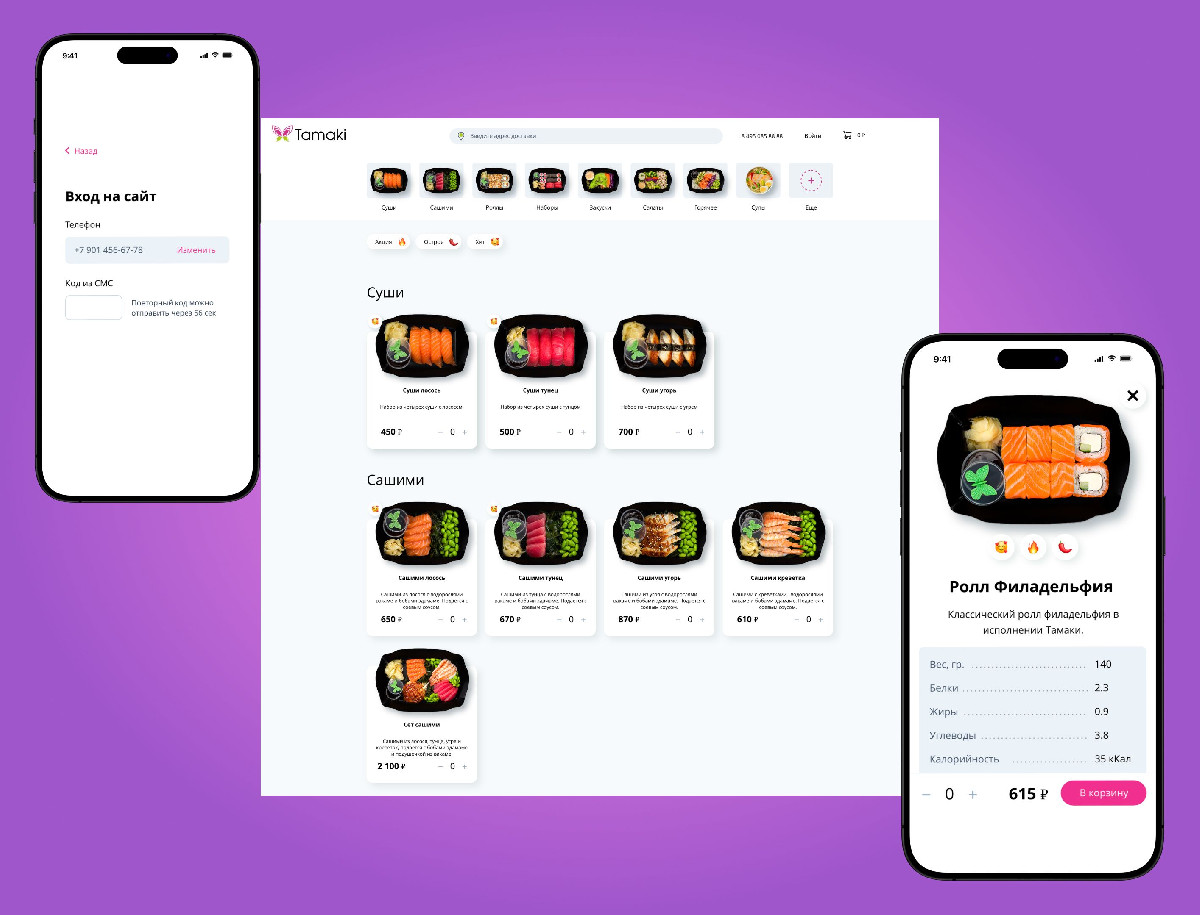 Разработка сайта для сервиса доставки «Тамаки» успешно завершена, в результате чего создан современный цифровой продукт, полностью ориентированный на максимальное удобство пользователя и оперативность работы. Применение SPA-архитектуры и лаконичного дизайна обеспечило высокую скорость взаимодействия и интуитивно понятный процесс заказа. Интеграция с CRM-системой Битрикс24 позволила выстроить эффективную систему управления заказами и клиентской базой. Благодаря продуманной навигации, адаптивности и минимизации действий пользователя сайт значительно повысил конверсию и лояльность клиентов, став надежным инструментом для роста бизнеса в конкурентной нише доставки японской кухни.