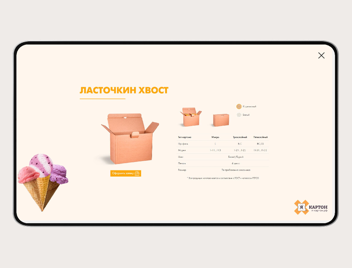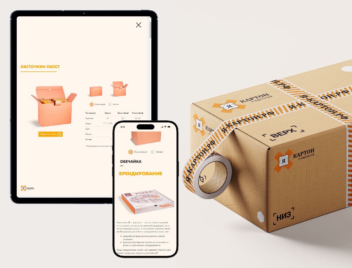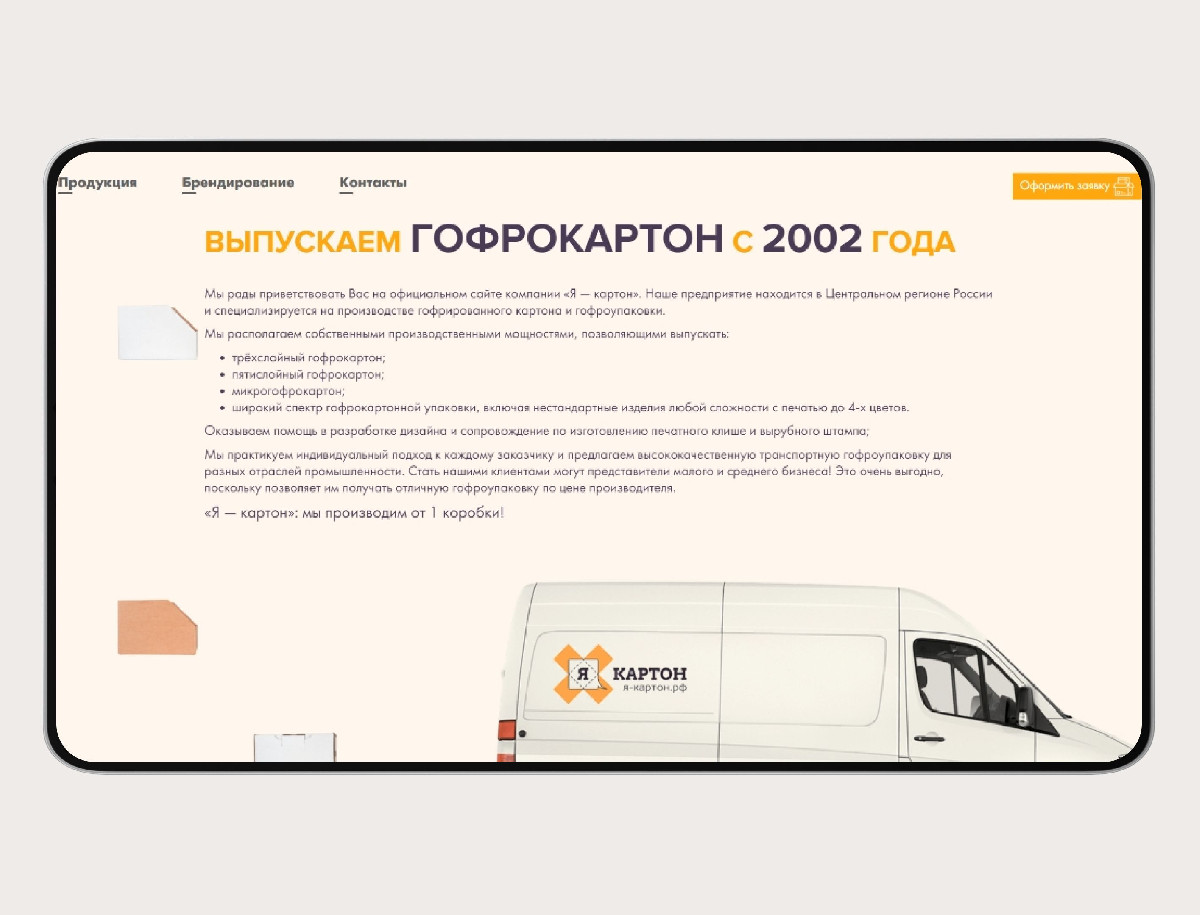 Разработанный лендинг для картонно-тарного комбината «Я – картон» успешно представляет компанию и её продукцию в интернете. Уникальный предзагрузчик с анимацией загрузки продуктов в коробку сразу вовлекает пользователя, подчеркивая тематику бизнеса. Лаконичный дизайн, удобная навигация и каталог с товарными карточками позволяют клиентам легко ознакомиться с ассортиментом гофроупаковки, её преимуществами и оформить заказ прямо на сайте. Лендинг повысил онлайн-видимость компании, упростил процесс взаимодействия с клиентами и способствовал увеличению числа заказов.