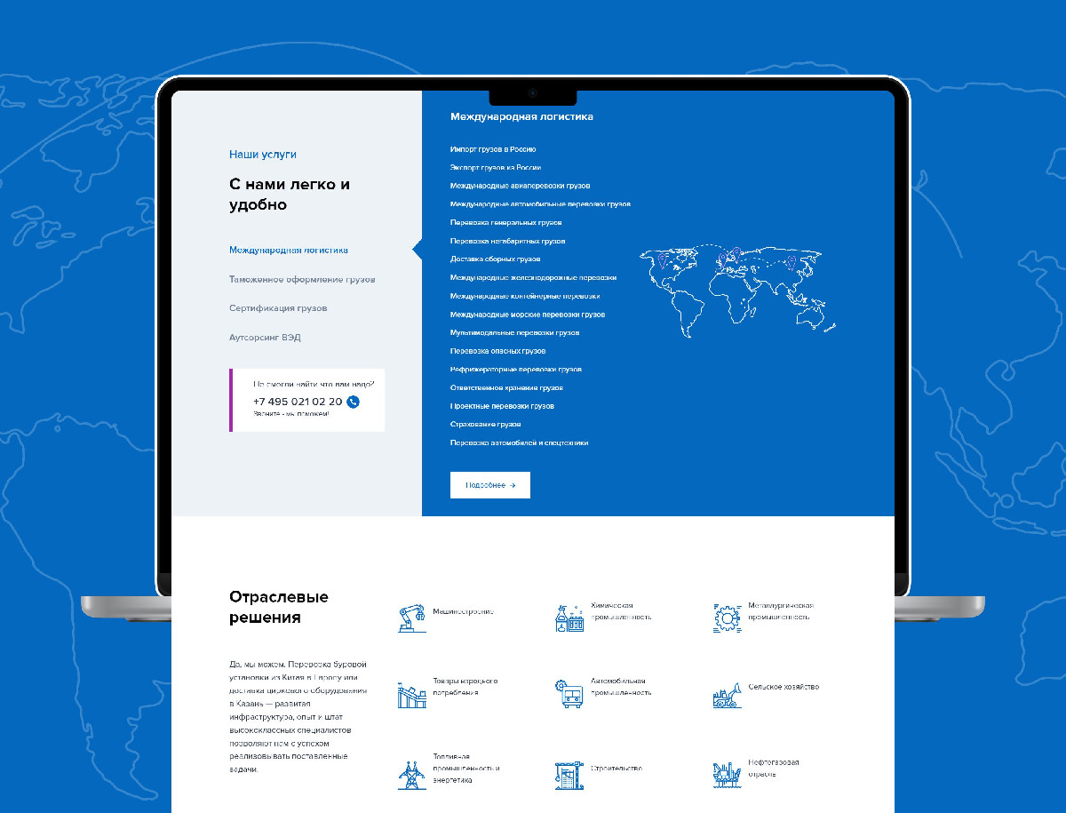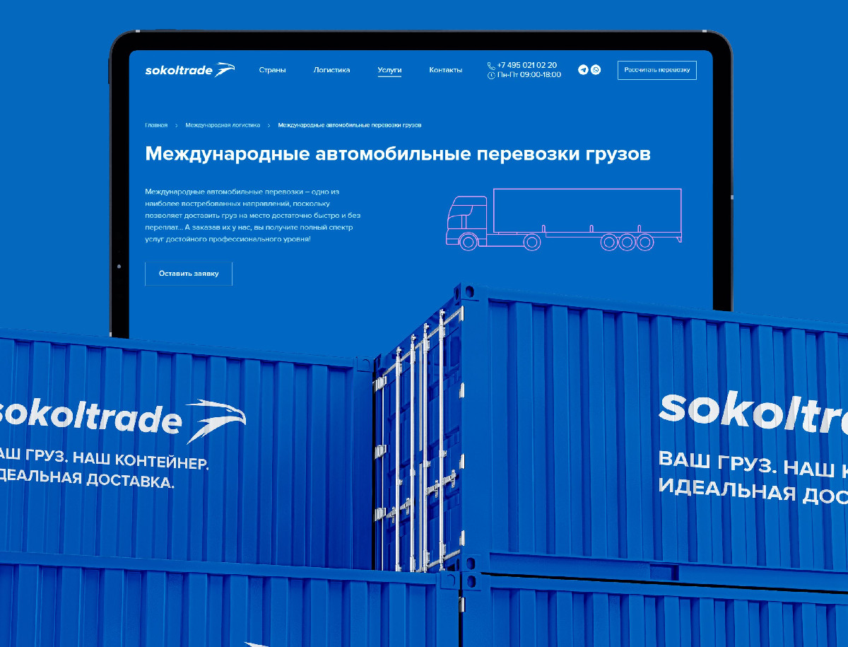 Разработать сайт для логистической компании «Сокол Трейд», который бы отражал масштаб и преимущества компании, предоставлял удобный инструмент для выбора услуг и расчёта стоимости перевозок. Сайт должен был быть функциональным, информативным и соответствовать корпоративному стилю компании.