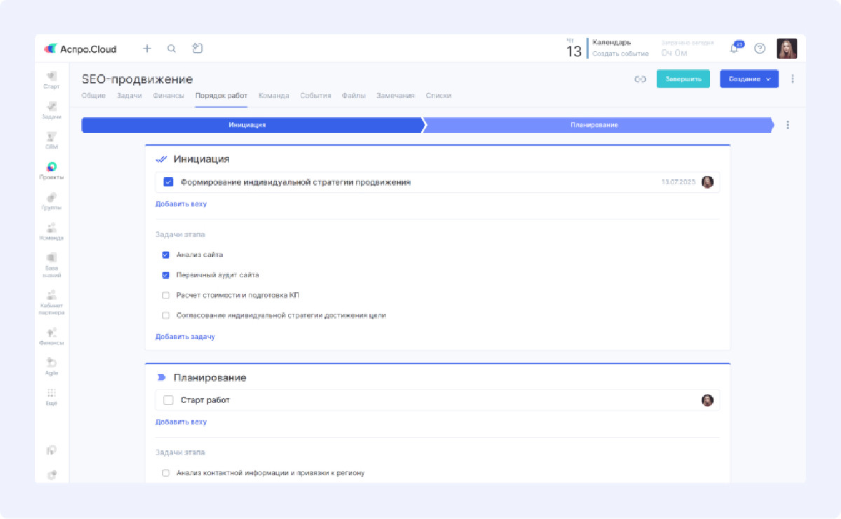 Модуль «Проекты» решил проблему контроля многоэтапных услуг. Команда создала шаблоны для каждой комплексной услуги с детализацией до 30 шагов. Теперь сотрудники видят текущий этап проекта и список выполненных задач. Запуск нового проекта происходит одним нажатием кнопки.