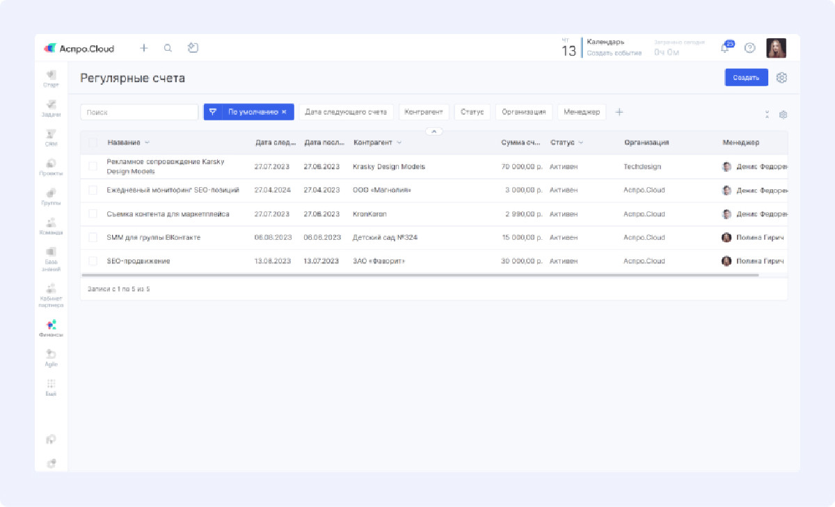 Настройка регулярных счетов устранила проблему несвоевременной оплаты. Система автоматически генерирует и отправляет счета клиентам по установленному графику, что исключило потери дохода из-за человеческого фактора.