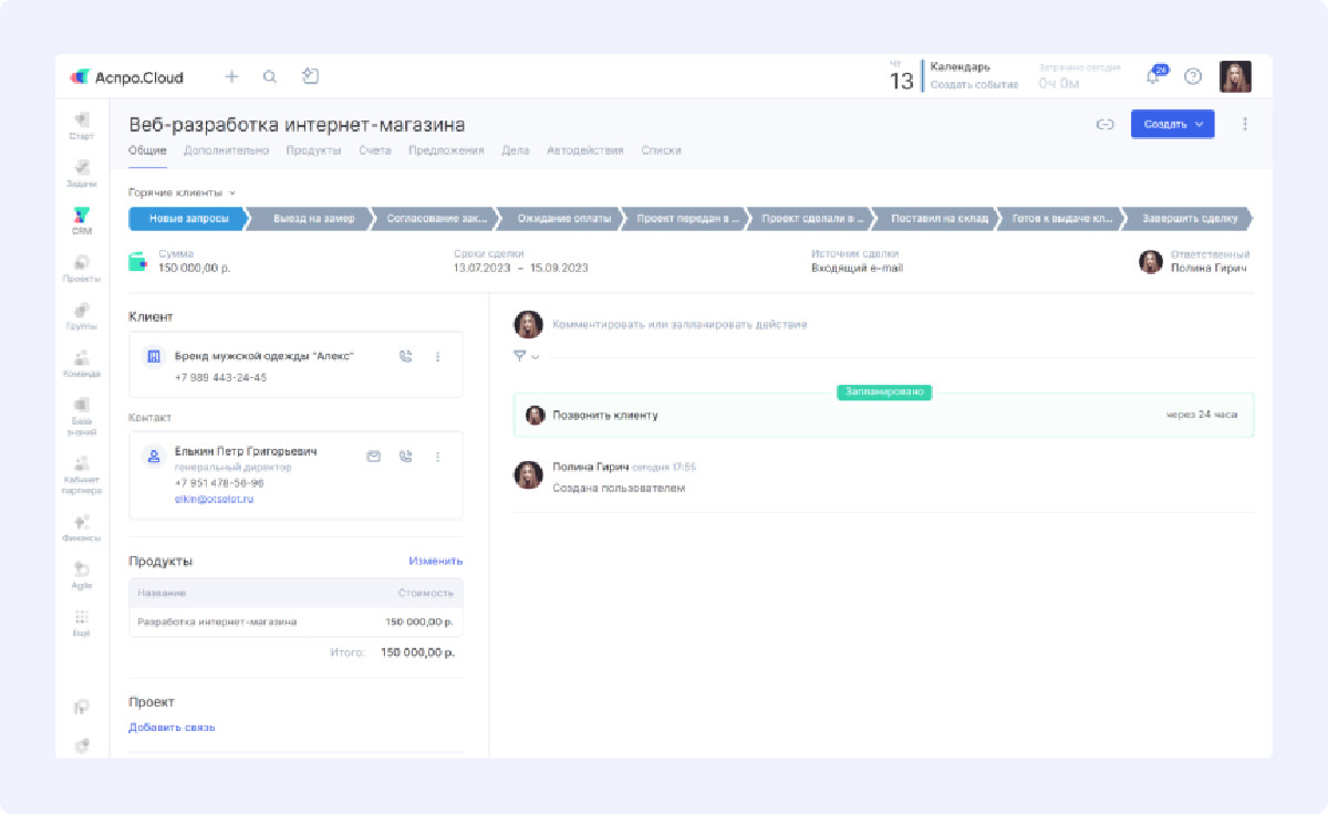 CRM-модуль автоматизировал сбор заявок со всех каналов связи и создание карточек контрагентов. Это позволило единственному менеджеру по продажам эффективно обрабатывать возросший поток лидов без найма дополнительного персонала.