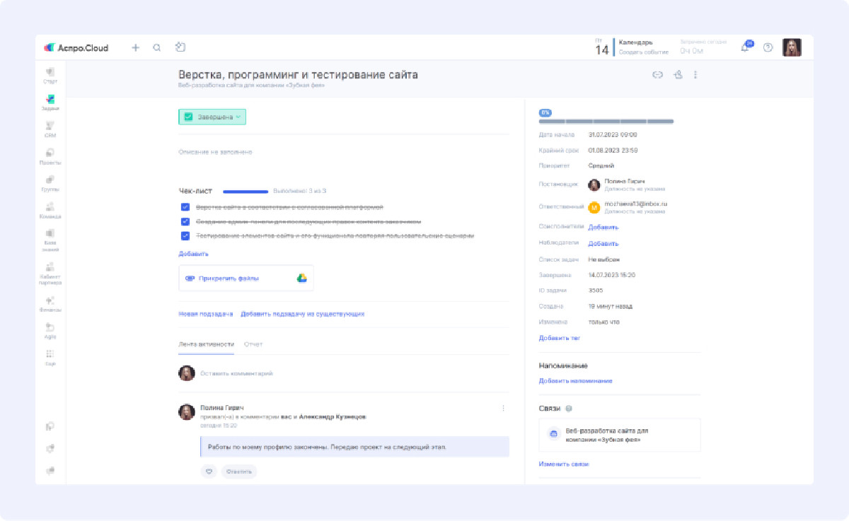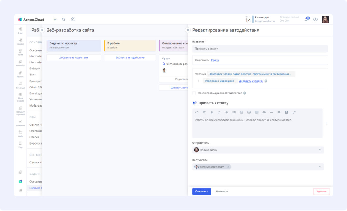Автодействия в системе наладили передачу задач между отделами. Завершение этапа работы автоматически уведомляет следующего ответственного специалиста, что устранило простои проектов.