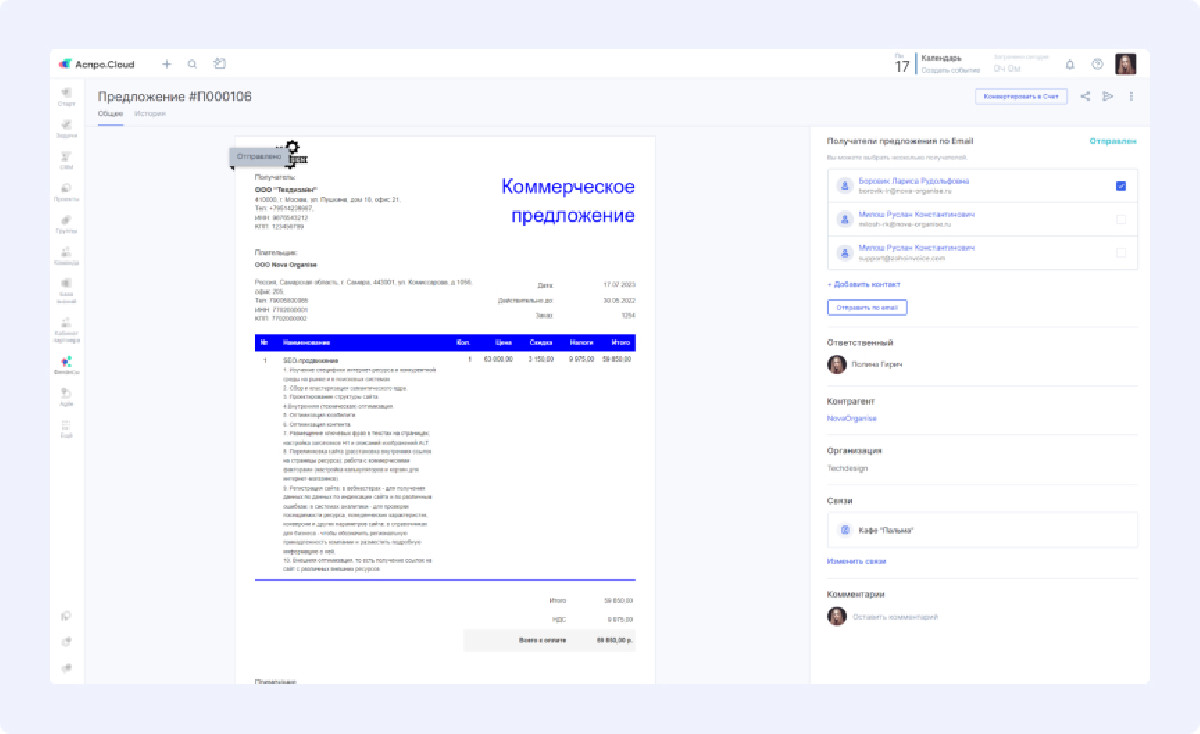 Конструктор шаблонов КП исключил ошибки в данных клиентов и ускорил процесс подготовки предложений. Система автоматически подставляет реквизиты и описание услуг.