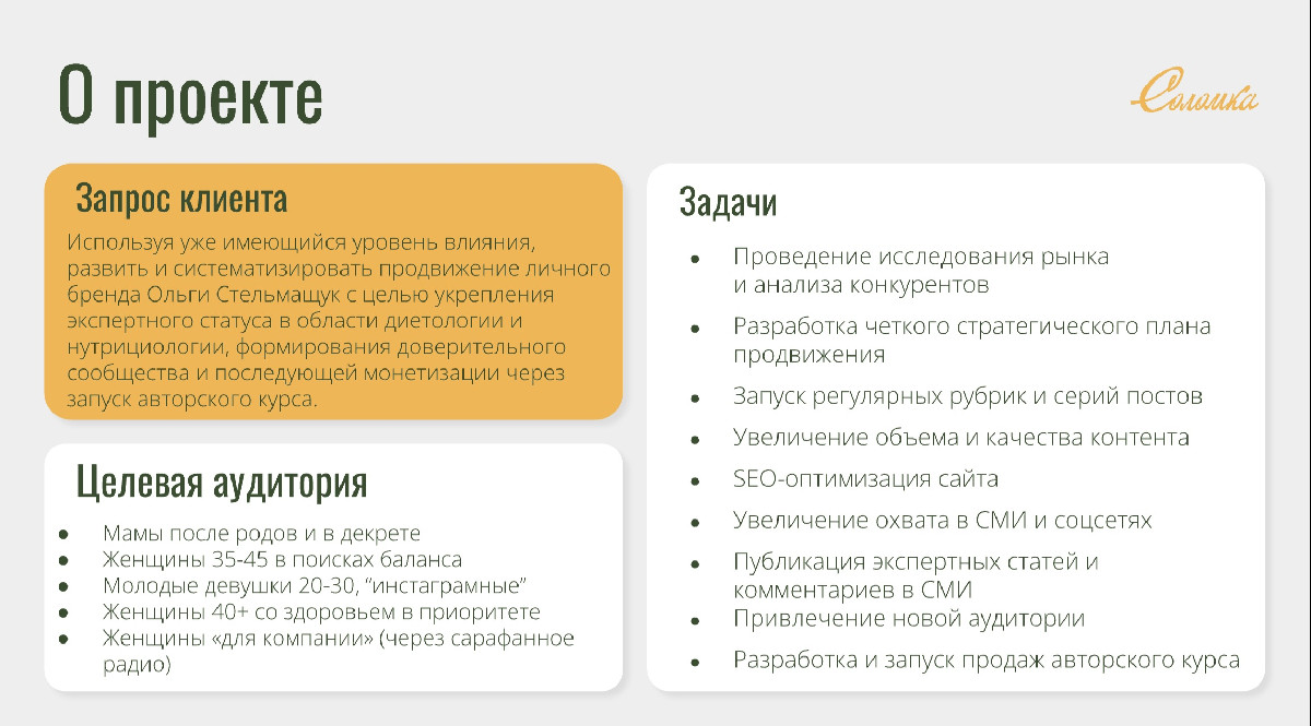 Ольга обратилась с запросом использовать уже имеющийся уровень влияния для системного развития личного бренда с целью укрепления экспертного статуса в области диетологии и нутрициологии, формирования доверительного сообщества и последующей монетизации через запуск авторского курса.