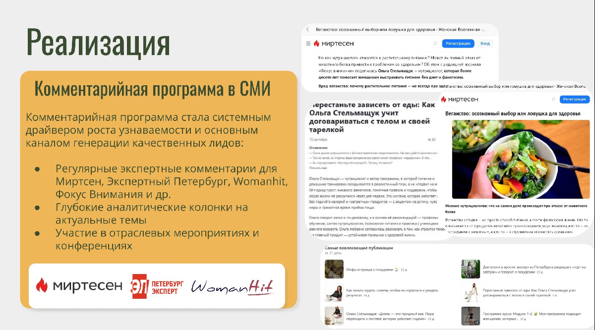 - Расширение медиаприсутствия через публикации в СМИ и экспертные комментарии.