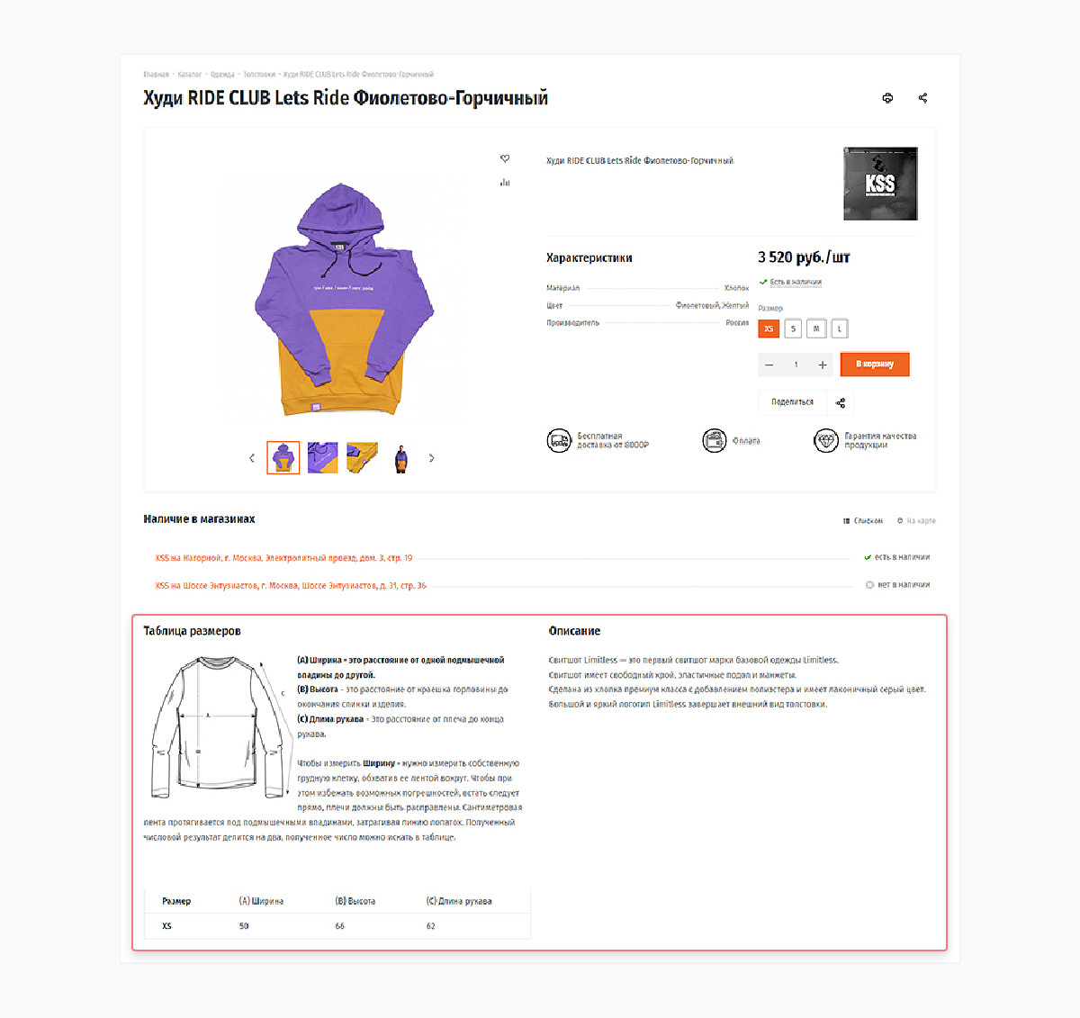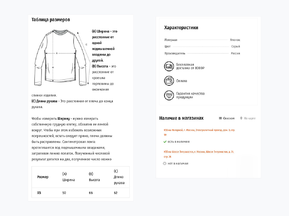 Разработчики кардинально пересмотрели архитектуру страницы. Характеристики переместили в верхнюю часть к блоку с ценой, освободив место под фотографиями для двух информационных секций: таблицы размеров и описания товара.