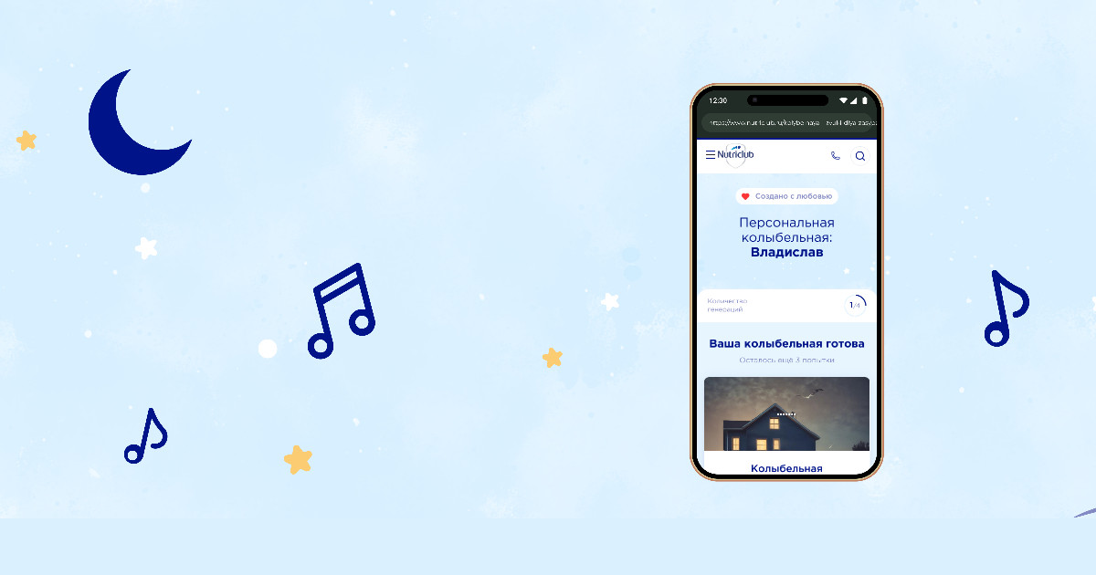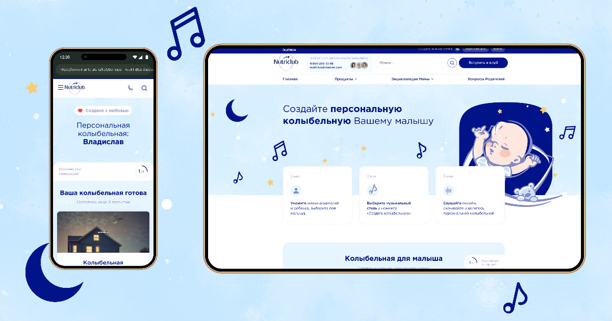Заказчик — крупный бренд, желающий укрепить эмоциональную связь с молодой аудиторией родителей. Основная задача — создать уникальный, вызывающий отклик проект, который бы выделился среди маркетинговых активностей и укрепил узнаваемость бренда. Требование — реализовать функционал генерации персонализированной колыбельной в кратчайшие сроки, обеспечить стабильность и высокий уровень вовлеченности, а также встроить результат в брендовый портал.
