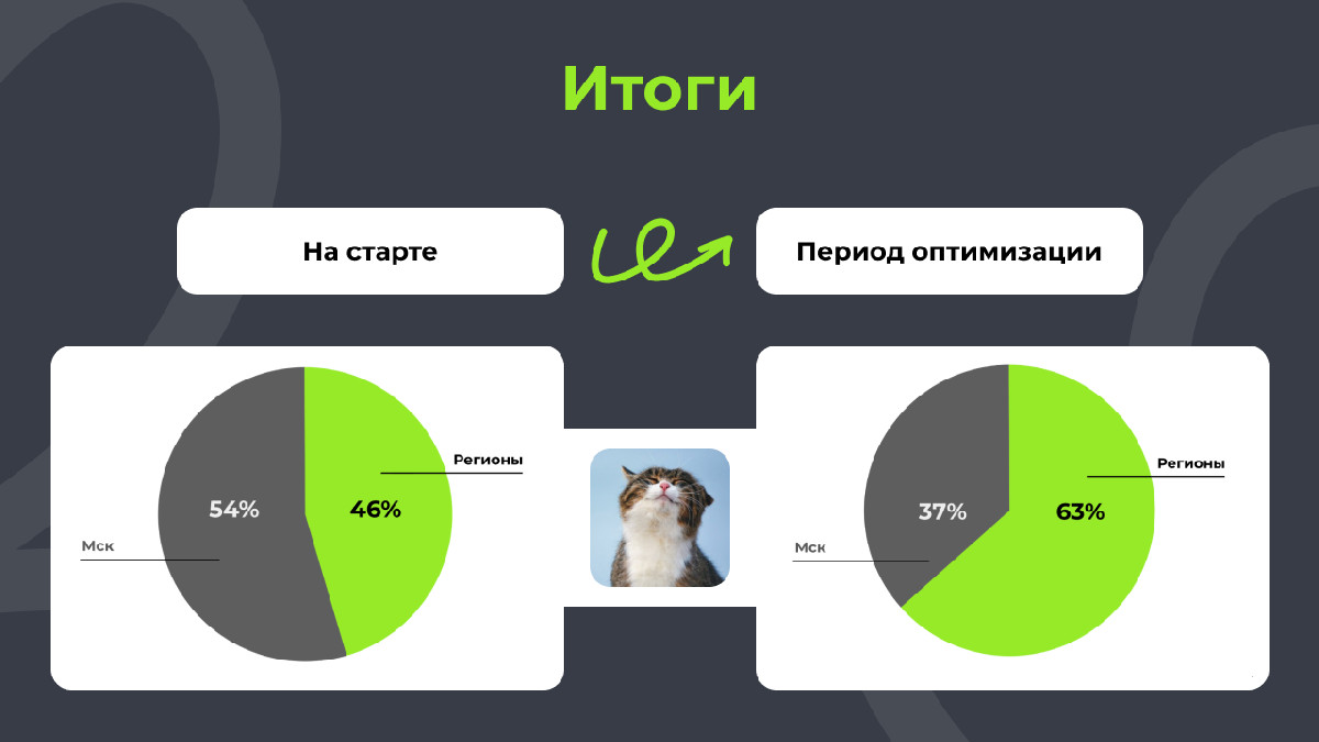 По итогам теста в Kayzen уже в первый месяц удалось увеличить долю новых пользователей из регионов с 46% до 63%. Это позволило источнику привлекать пользователей из целевых городов и обеспечить масштабирование кампании.
