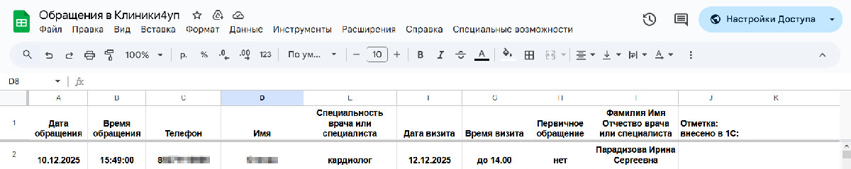 Все данные из диалогов автоматически записываются в Google-таблицу, к которой имеют доступ руководство и администраторы клиники. В таблице сохраняется информация: