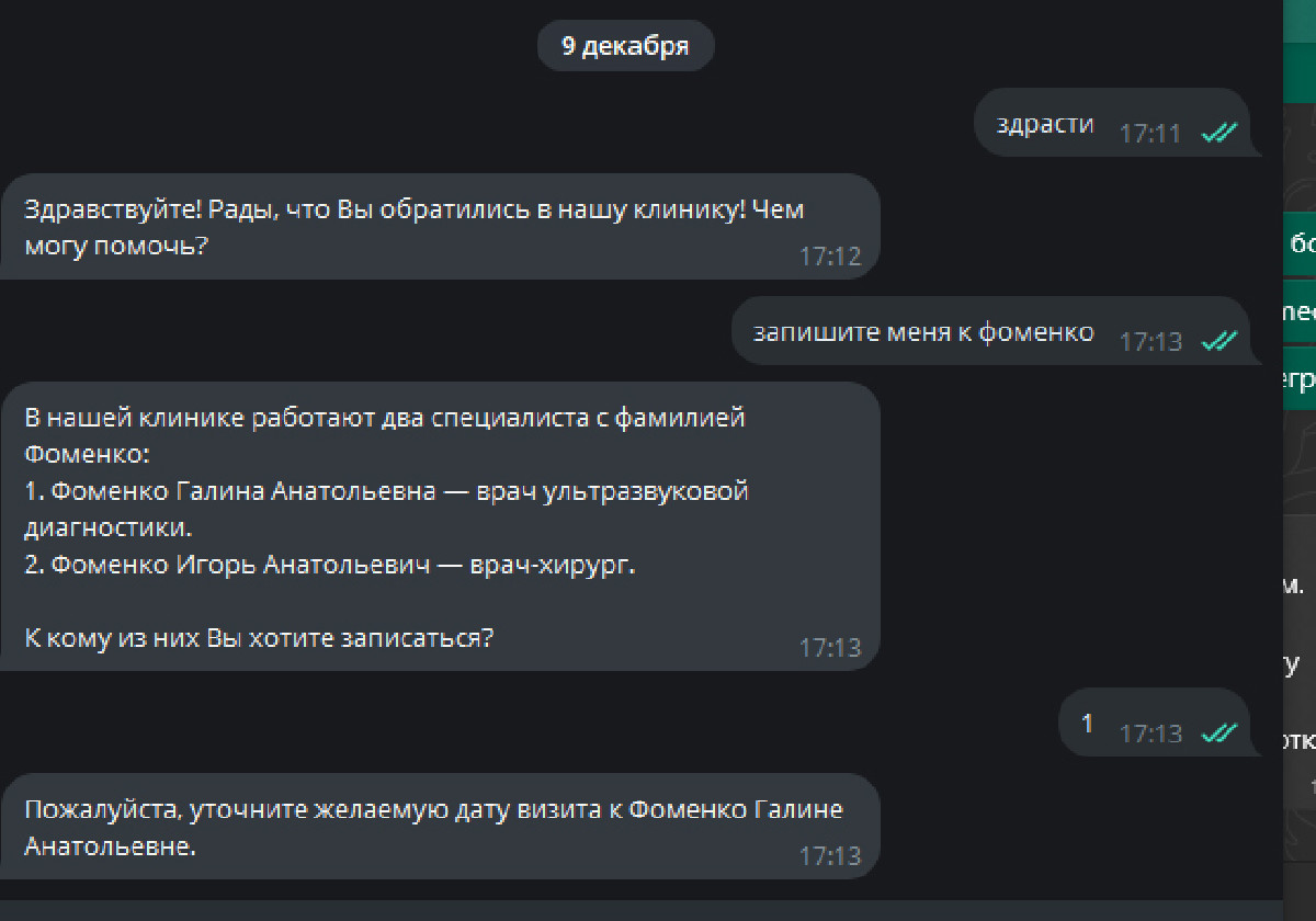 Благодаря проработанной инструкции, обучению по предоставленной заказчиком информации и тщательной отладке ИИ-сотрудник легко справляется с нешаблонными ситуациями. Например, когда одной фамилии врача недостаточно для идентификации специалиста.