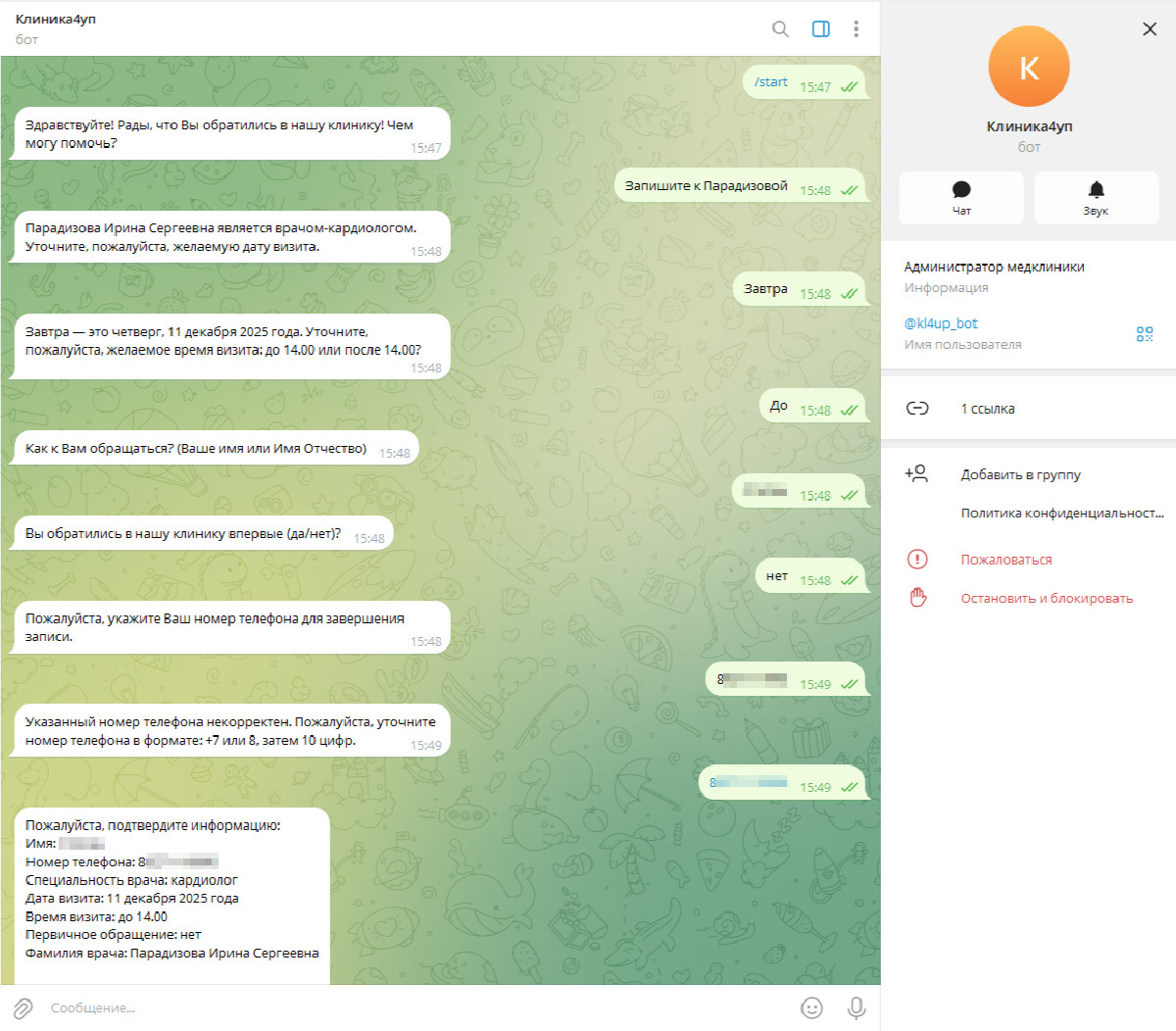 - Ловили ошибки: неправильные ответы ИИ-бота, забытые поля для записи на визит к врачу.
