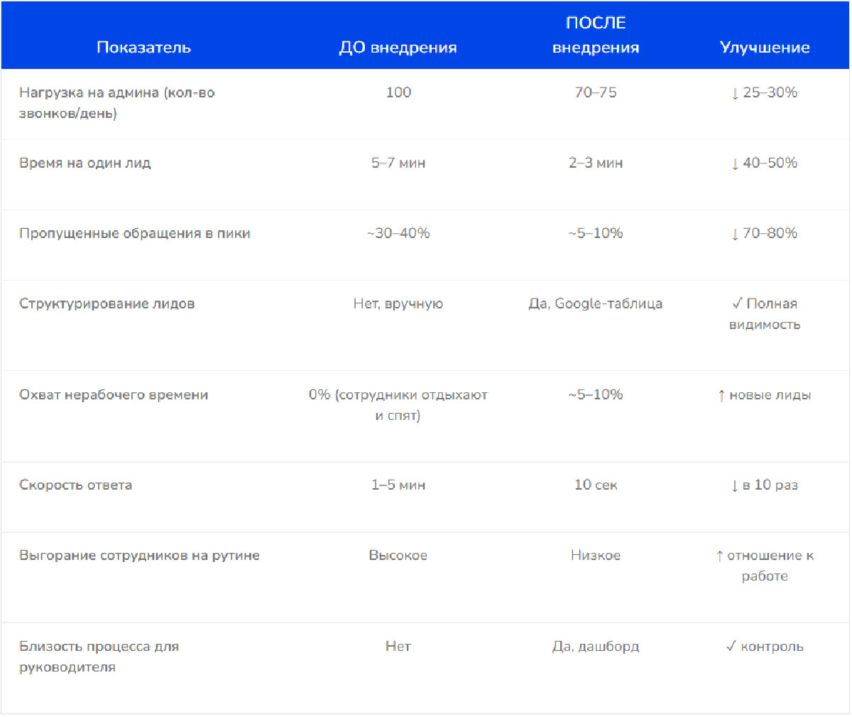 Нет стресса от пропущенных звонков, нет хаоса. Google-таблица запоминает все обращения. Уменьшается выгорание и текучесть персонала.
