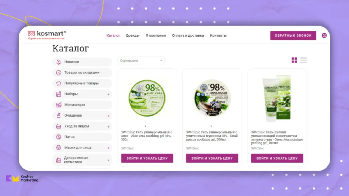 Перед нами стояла непростая задача — помочь компании Kosmart, специализирующейся на поставках корейской и японской косметики, увеличить количество заказов и лидов среди оптовых покупателей из Москвы, Санкт-Петербурга и Нижнего Новгорода. Основной фокус был направлен на привлечение оптовиков, заинтересованных в закупке азиатской косметики.
