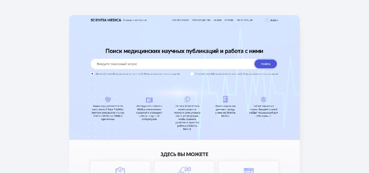 На главной странице размещён основной инструмент сервиса — поиск статей. Также представлена информация о сервисе, его возможностях, а также тарифы с пробным периодом на сутки.