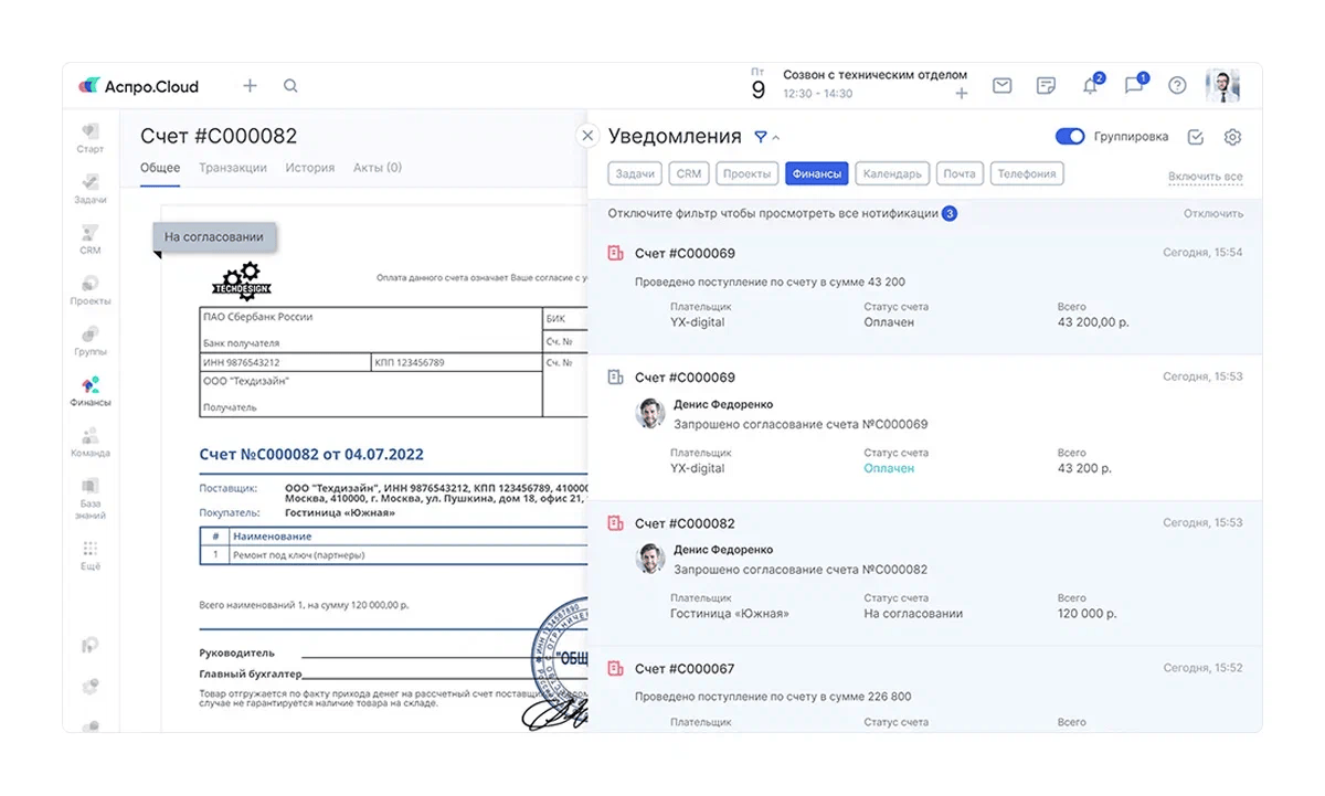 Миграция обратно в Аспро.Cloud прошла относительно безболезненно. Шаблоны документов уже были настроены, требовалось лишь перенести финансовый учет. Система была сконфигурирована так, чтобы счета и акты автоматически подгружались в модуль финансов сразу после формирования.
