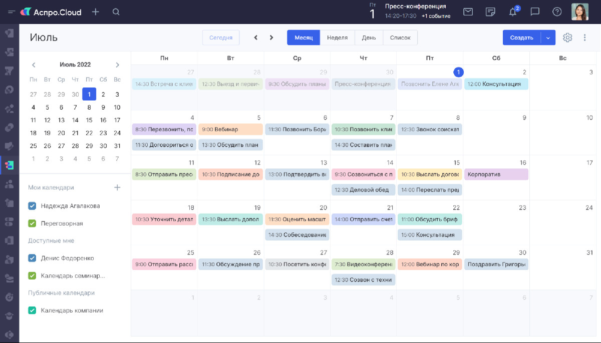 Внедрение началось с настройки базового функционала. В первую очередь команда сконфигурировала календарь для удобного планирования встреч. В Аспро.Cloud настроили совместный доступ к модулю, что позволило назначать мероприятия совместно с коллегами. Также была настроена синхронизация с сервисами Google для ведения личных календарей.