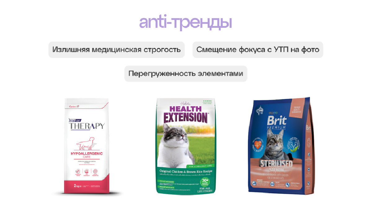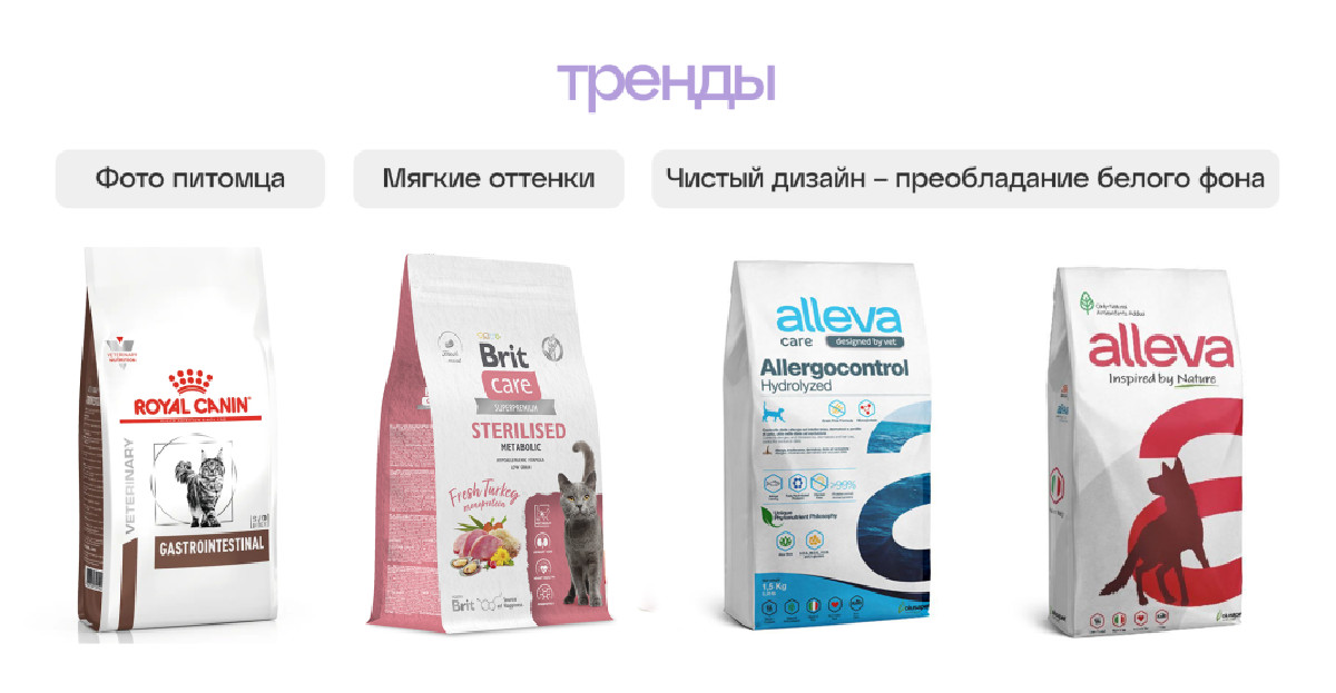 В дизайн-исследовании мы выделили визуальные тренды оформления кормов. Это стало отправной точкой разработки дизайн-концепции.