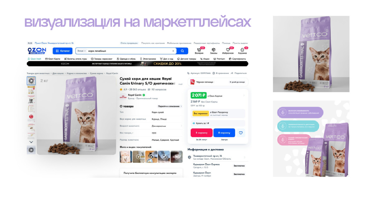 Кормов для питомцев на маркетплейсах множество, просто так стать постояльцем в корзине клиента не так уж и просто. Одних выбирают по советам ветеринаров, других за красивую упаковку. Нашей задачей было грамотно преподнести бренд клиентам, чтобы показать: бренду можно доверять.