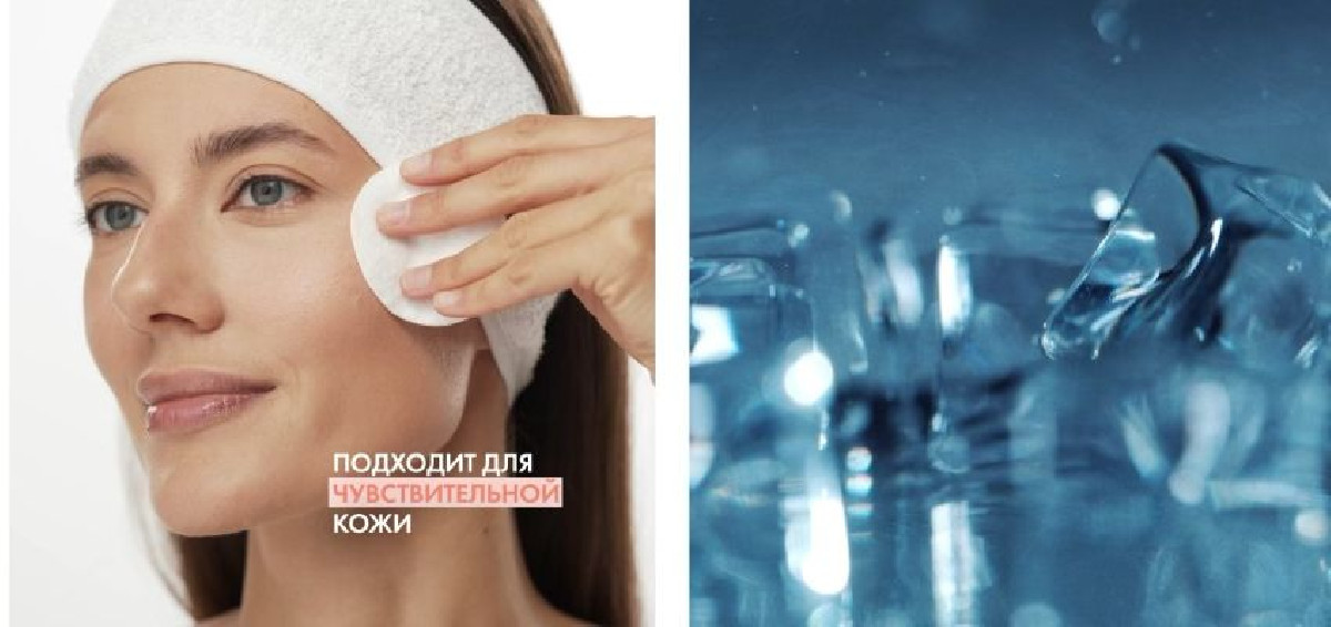 Здесь мы сделали акцент на видимом результате, показав, как лосьон удаляет макияж. Повязка отсылала к домашнему уходу, а лёд – к термальной воде в составе.