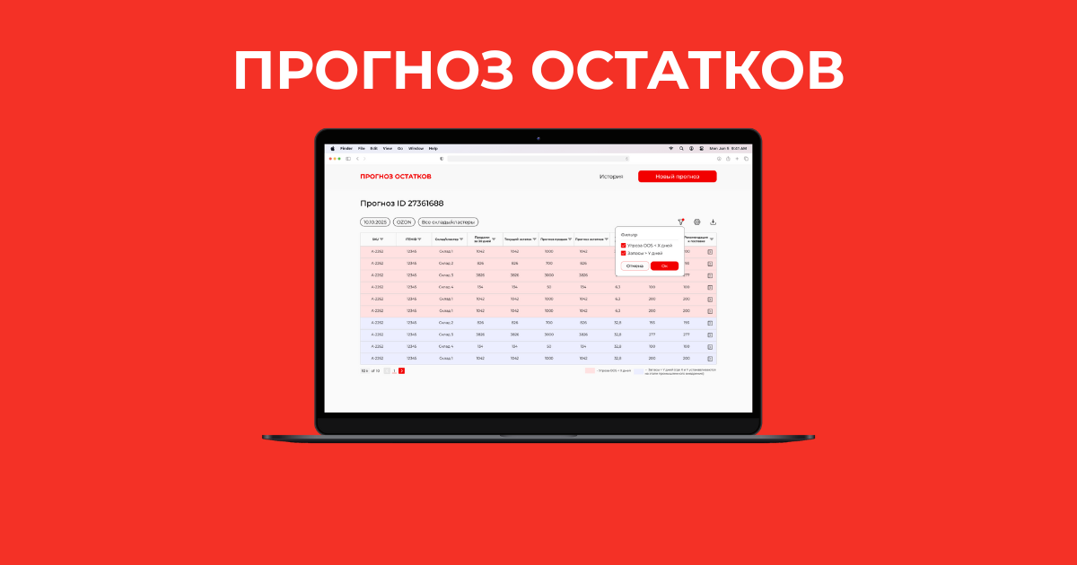 Сервис применяет ML-подходы к данным о продажах и остатках на Ozon и Wildberries, позволяет клиенту задавать параметры (период прогноза, маркетплейс, кластер/регион) и вручную корректировать значения поставок, а также автоматически формирует рекомендации по пополнению, снижая объём ручной работы.
