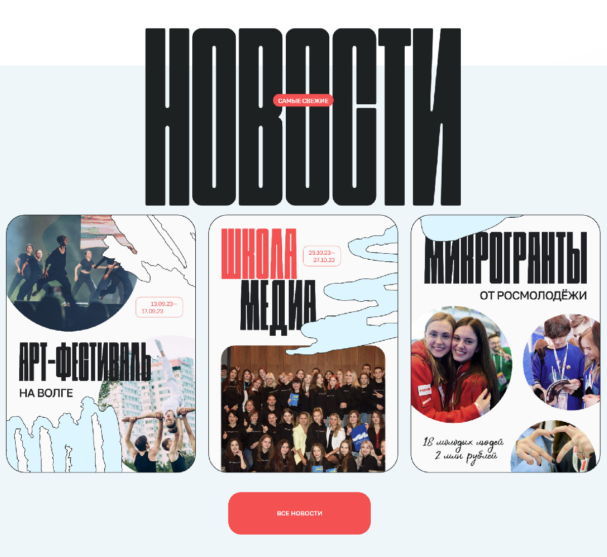 Блок с новостями есть на главной странице, с переходом на внутреннюю — для тех, кто хочет найти нужную информацию максимально быстро. Раздел «новости» — главный канал связи между организаторами мероприятий и молодёжью.