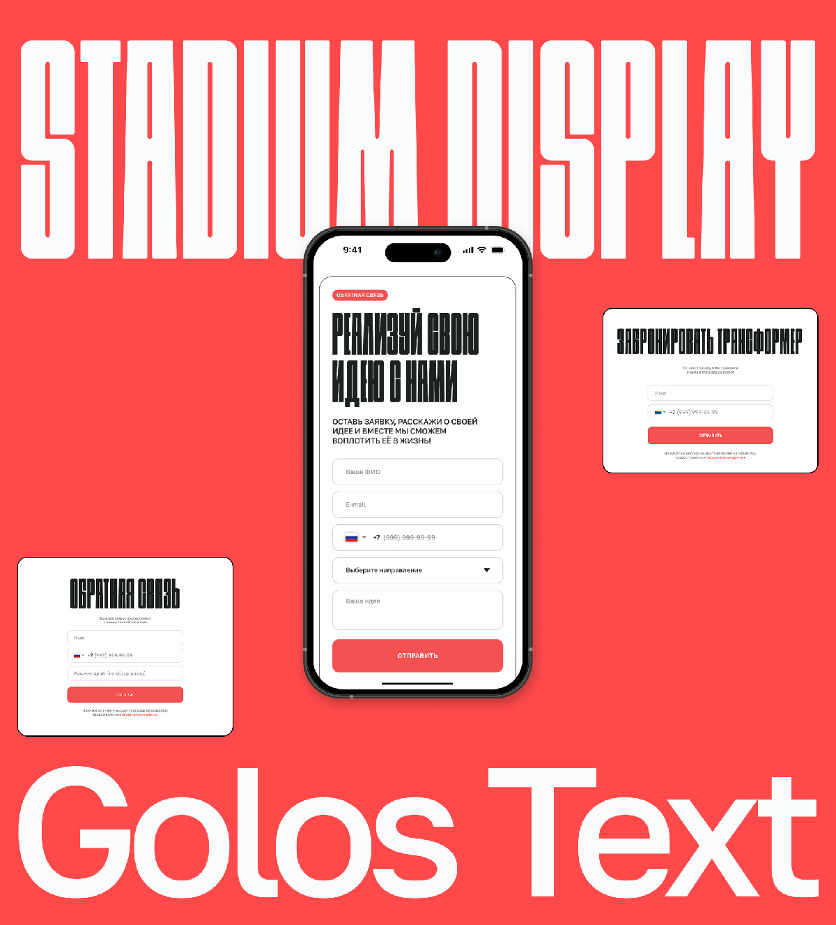 Использовали бесплатный шрифт «Stadium Display» для заголовков. Он отвечает мягкому направлению молодежи в сторону развития за счет скругления и крупной типографики. «Stadium Display» использовали для объяснения информации,а для декоративных описаний и создания настроения использовали шрифт «Anjhay». Для простого описания текста и максимальной читабельности использовали шрифт «Golos Text».