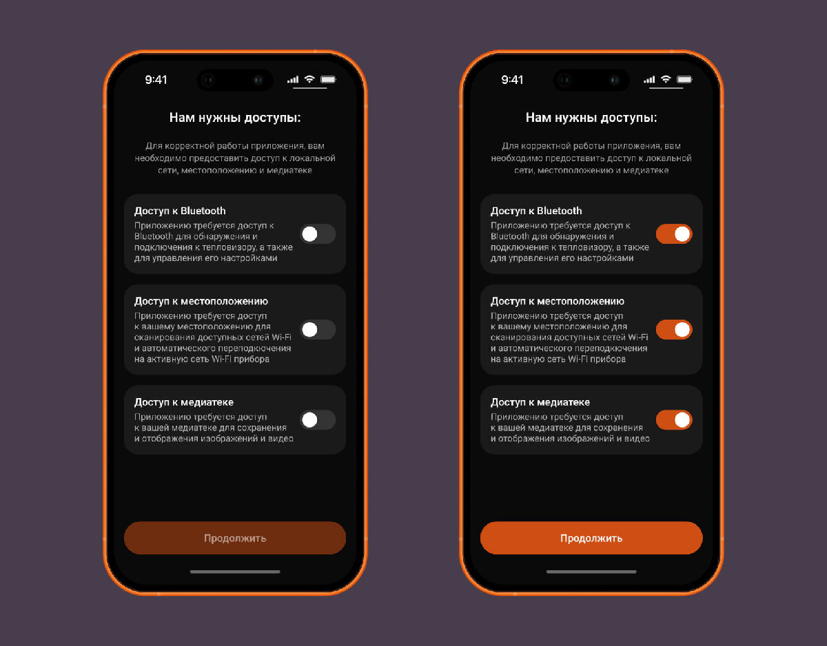 - iOS: доступ к галерее, геолокации, Bluetooth и локальной сети — вынесли на один экран с понятными пояснениями, почему это нужно.