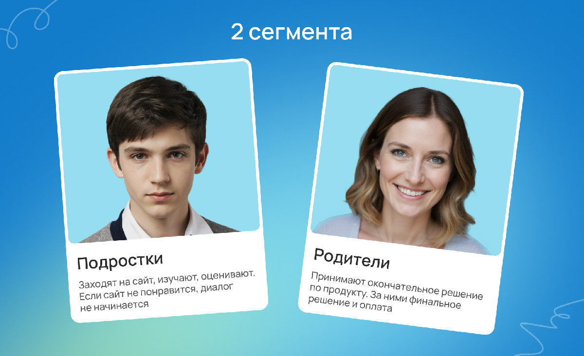 Мы начали с определения структуры сайта. Не могли опереться на готовую схему – её не было, поэтому стартовали с анализа целевой аудитории. Чтобы понять, какие блоки и тексты ей важны, ориентировались на типовые вопросы, которые возникают у родителей и подростков в подобных проектах. Так построили архитектуру главной страницы, где каждый блок работает на доверие и вовлечение: