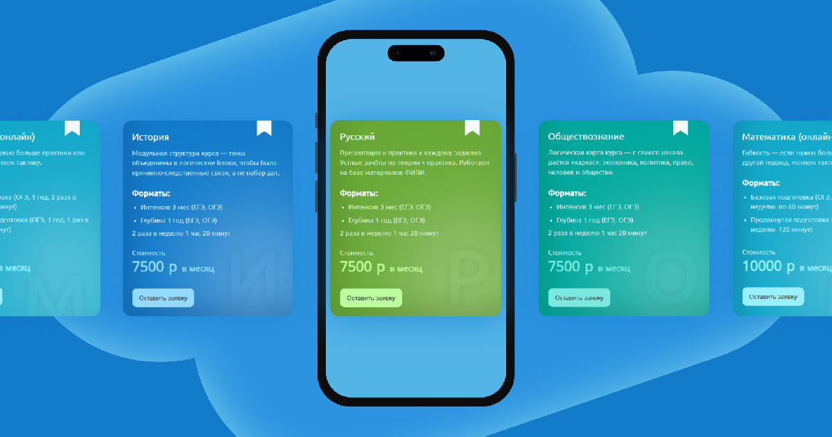 - Ключевые разделы сайта – «Подготовка к ЕГЭ/ОГЭ», «Базовый курс» и «Интенсив». Каждая внутренняя страница структурирована так, чтобы пользователь быстро понял, в чём суть программы и чем она отличается от других. Поэтому информацию решили подавать блоками: короткий текст, чёткий акцент, понятная кнопка действия. Визуальные элементы – с динамикой и лёгкой асимметрией за счёт масок, чтобы не было ощущения шаблонности.
