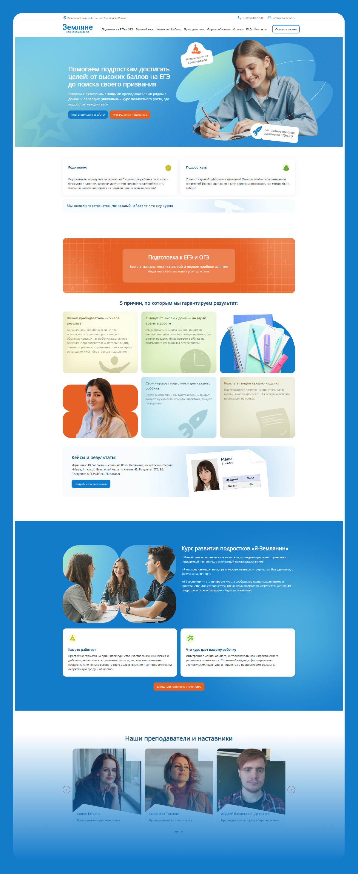На второй и третий день мы собрали внутренние страницы. Параллельно – дорабатывали контент. Сайт получился живым, дружелюбным и понятным и был принят таким, каким мы его задумали. Он помогает подросткам не бояться подготовки к экзаменам и видеть в ней поддержку, а не стресс. Каждый экран выстроен так, чтобы пользователь двигался по сайту с интересом и чувствовал легкость визуально, эмоционально и в навигации.