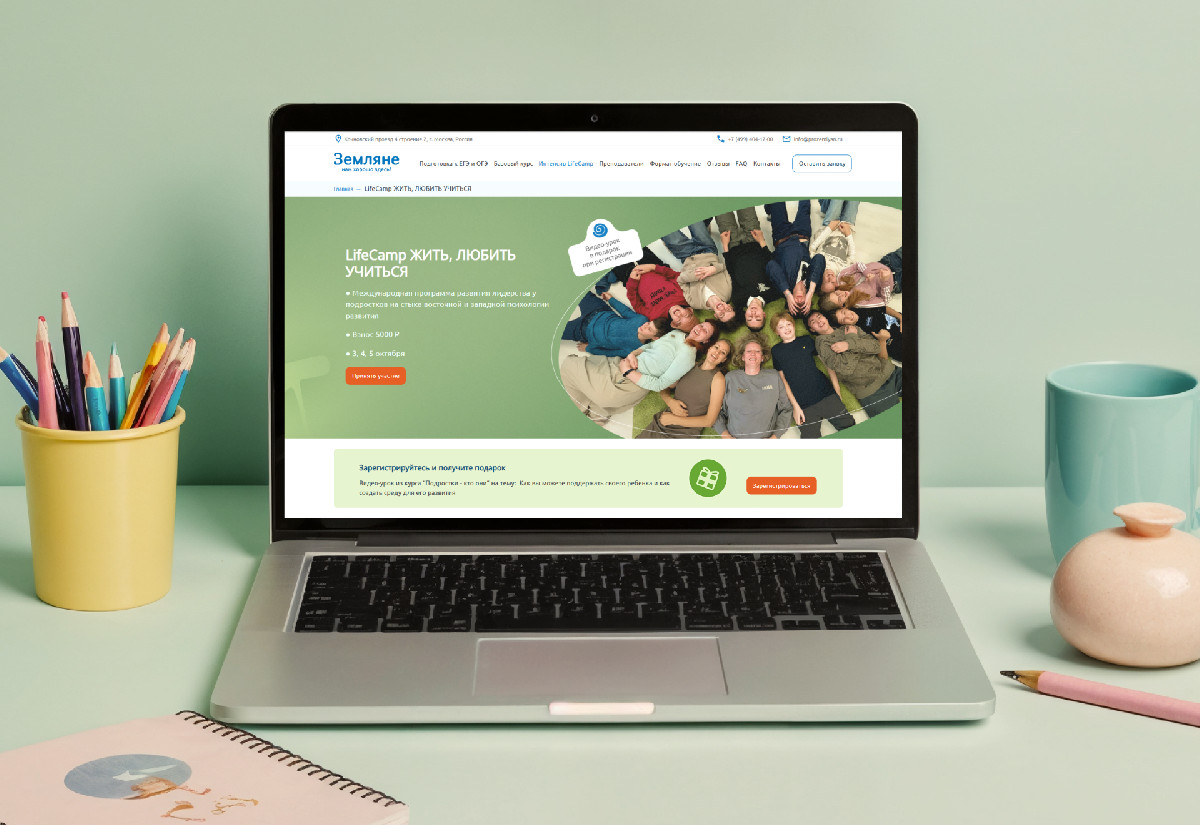 При этом запуск нужно было делать срочно. А сам сайт должен был отражать не только направление программ, но и передавать их ценностную основу: безопасность, уважение, открытость. Плюс – у каждого направления (экзамены, личностный рост, LifeCamp, индивидуальные занятия) свой формат и логика.