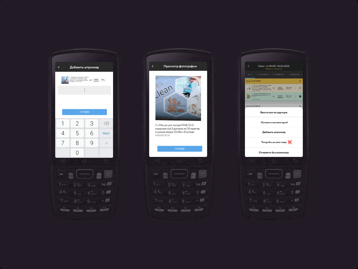 Для удобной сборки был реализованы интерфейсы обработки таких случаев как товарная позиция, от поставщика, пришедшая без штрих-кода, позиция с большим кол-вом товара, дефектная продукция и тд.