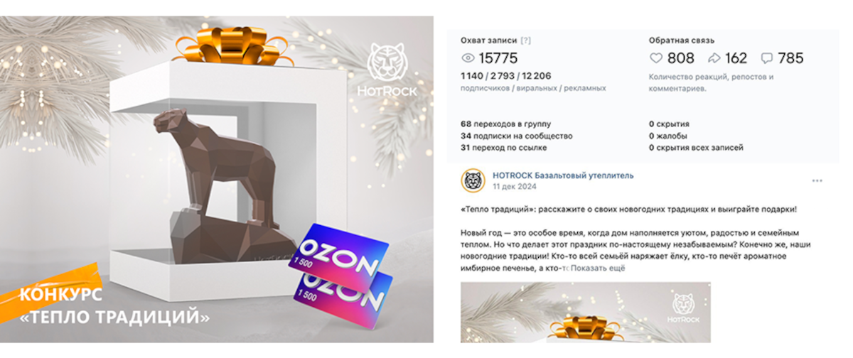 - Декабрь 2024 — мощный новогодний конкурс «Тепло традиций». Тысячи лайков, репостов и комментариев за неделю. Алгоритмы впервые «увидели», что сообщество живое. Этот конкурс стал отправной точкой: повысилась вовлеченность, посты начали чаще появляться в рекомендациях.